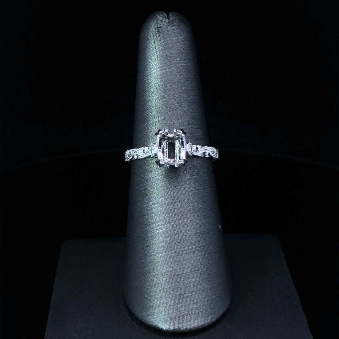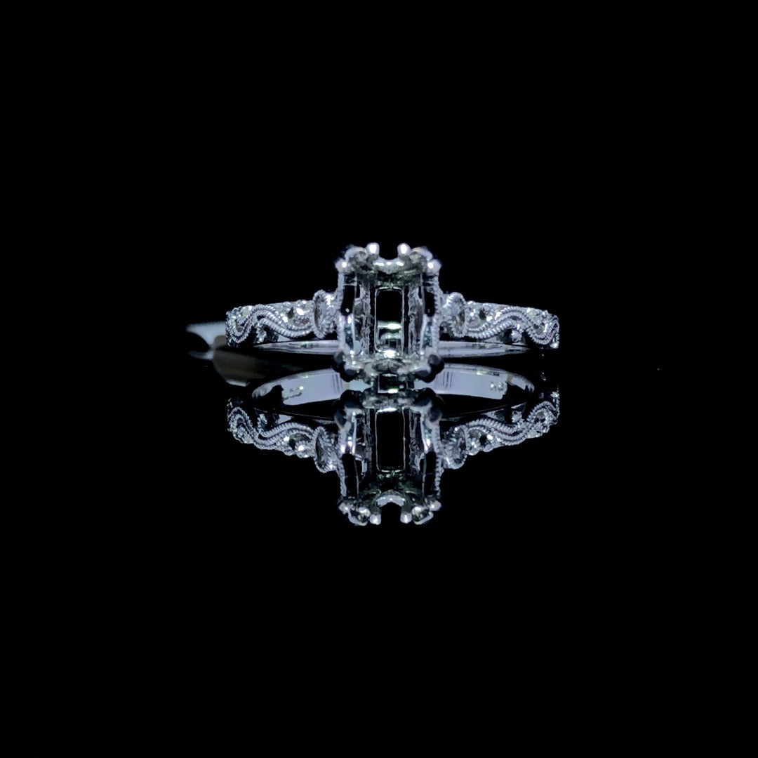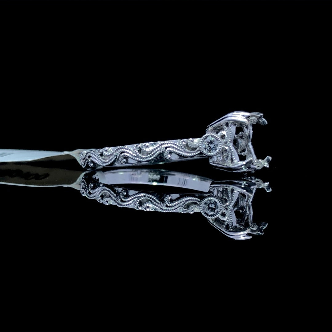 Experience the beauty and intricate design of this stunning diamond semi mount. The swirling etched design and .07ctw round diamond accents make every glance a new discovery. Crafted in shimmering 14kt white gold, add your choice of center stone to create a truly unique piece. Elevate your style with this one-of-a-kind creation! Price is for the semi mount only. Center stone will be added at an additional cost. This ring is a size 6.5. If that size is not a perfect fit, first time sizing is free at the time of purchase. Additional sizing fees may apply.