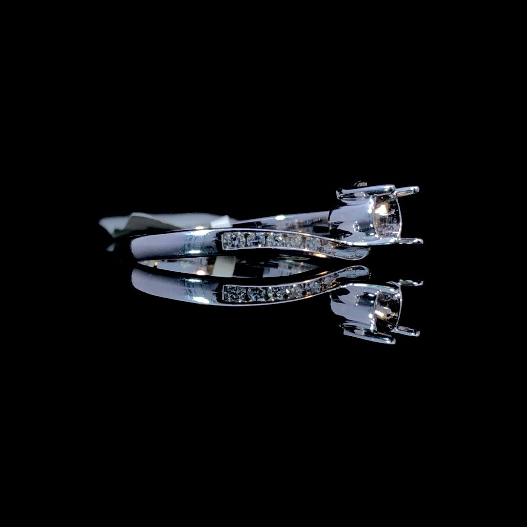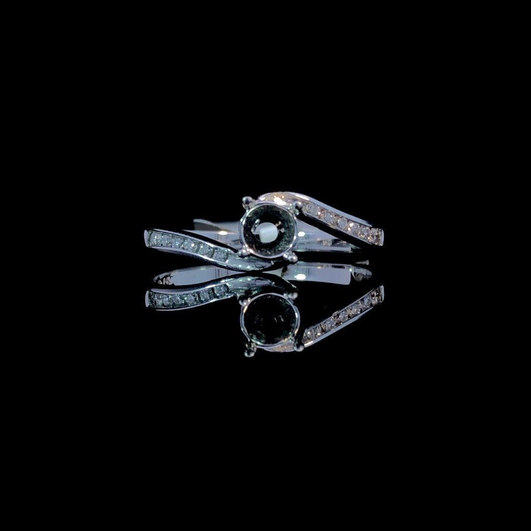 This charming diamond semi mount boasts a whimsical design with a swirling band adorned with .13ctw of round diamonds set in 14kt white gold. Choose from a wide variety of loose stones to personalize this chic piece and make it uniquely yours. Elevate your style with this stunning accessory! Price is for the semi mount only. Center stone will be added at an additional cost. This ring is a size 6.5. If that size is not a perfect fit, first time sizing is free at the time of purchase. Additional sizing fees may apply.