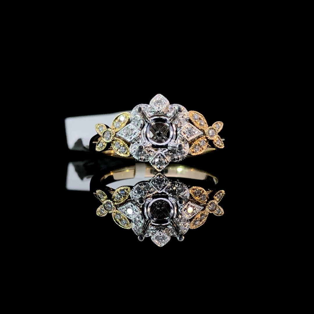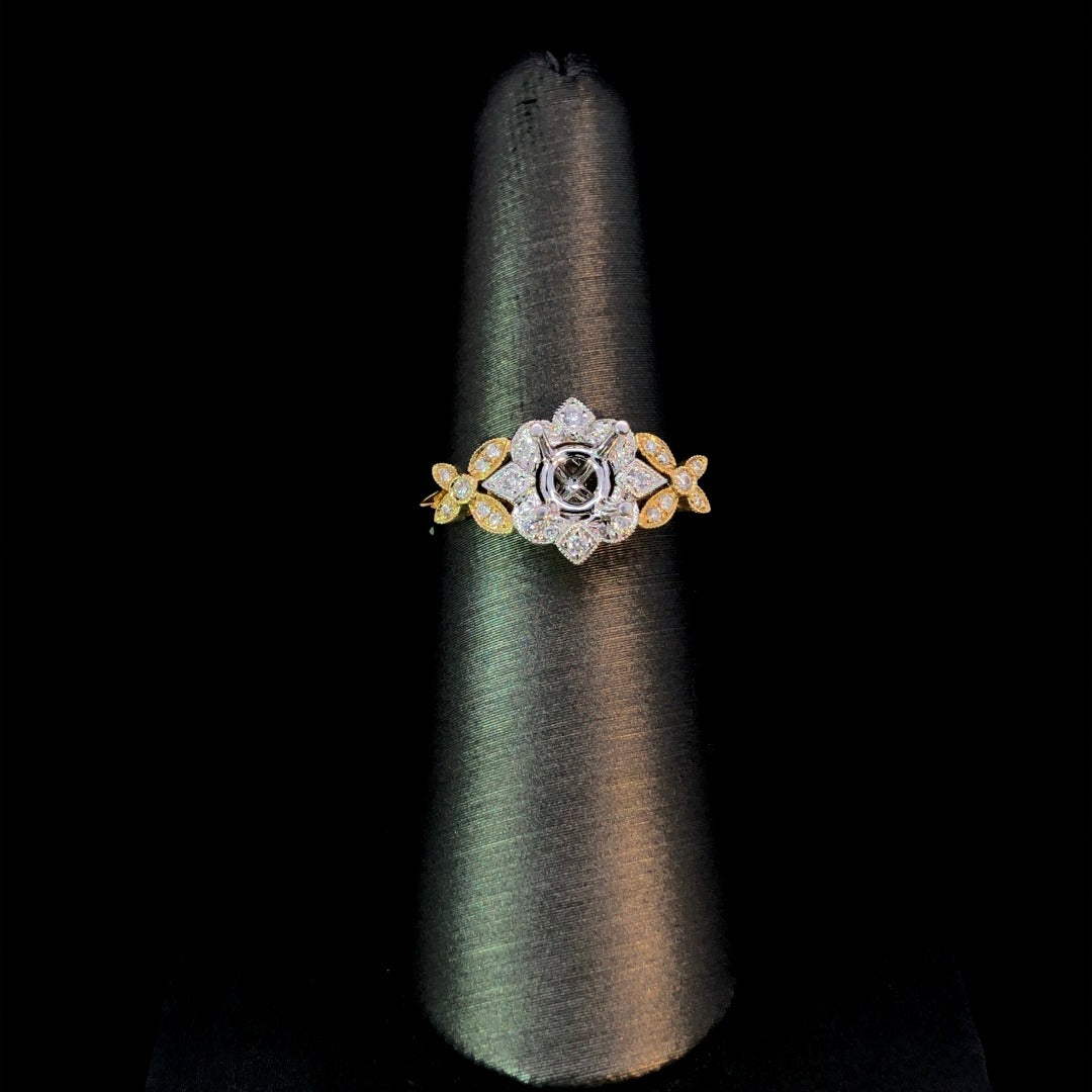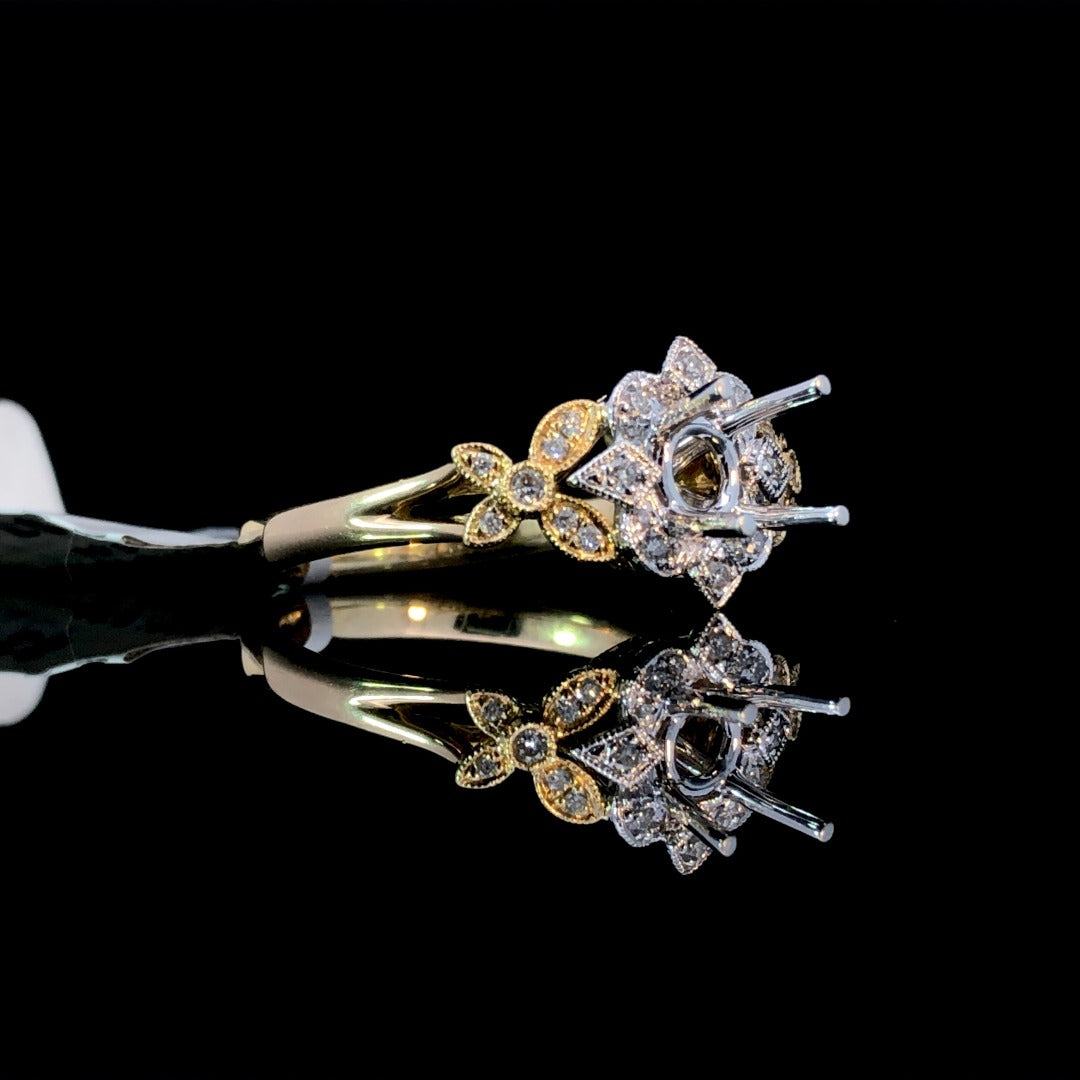 This stunning 14kt 2- tone gold semi mount showcases a decorative halo design with milgrain detailing and .22ctw of sparkling round diamond accents. With the option to choose from our large loose stone inventory, this piece is the perfect choice for the modern bride seeking a unique and customizable engagement ring. Price is for the semi mount only. Center stone will be added at an additional cost. This ring is a size 6.5. If that size is not a perfect fit, first time sizing is free at the time of purchase. Additional sizing fees may apply.