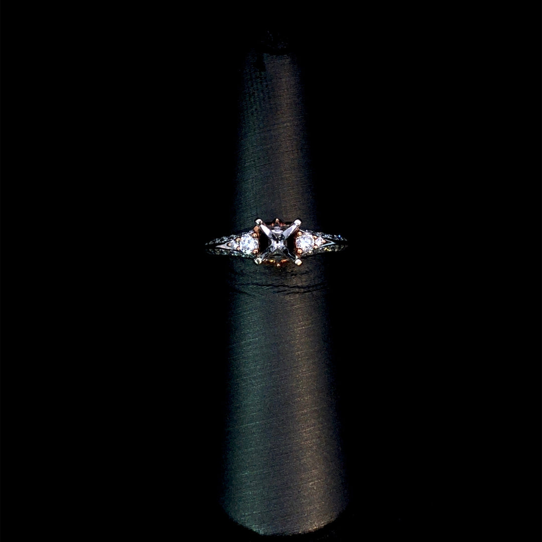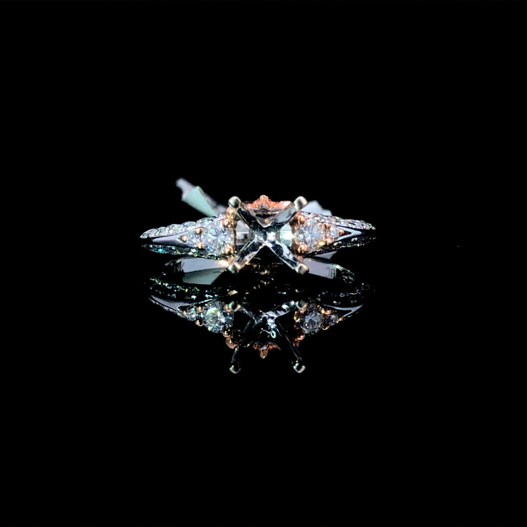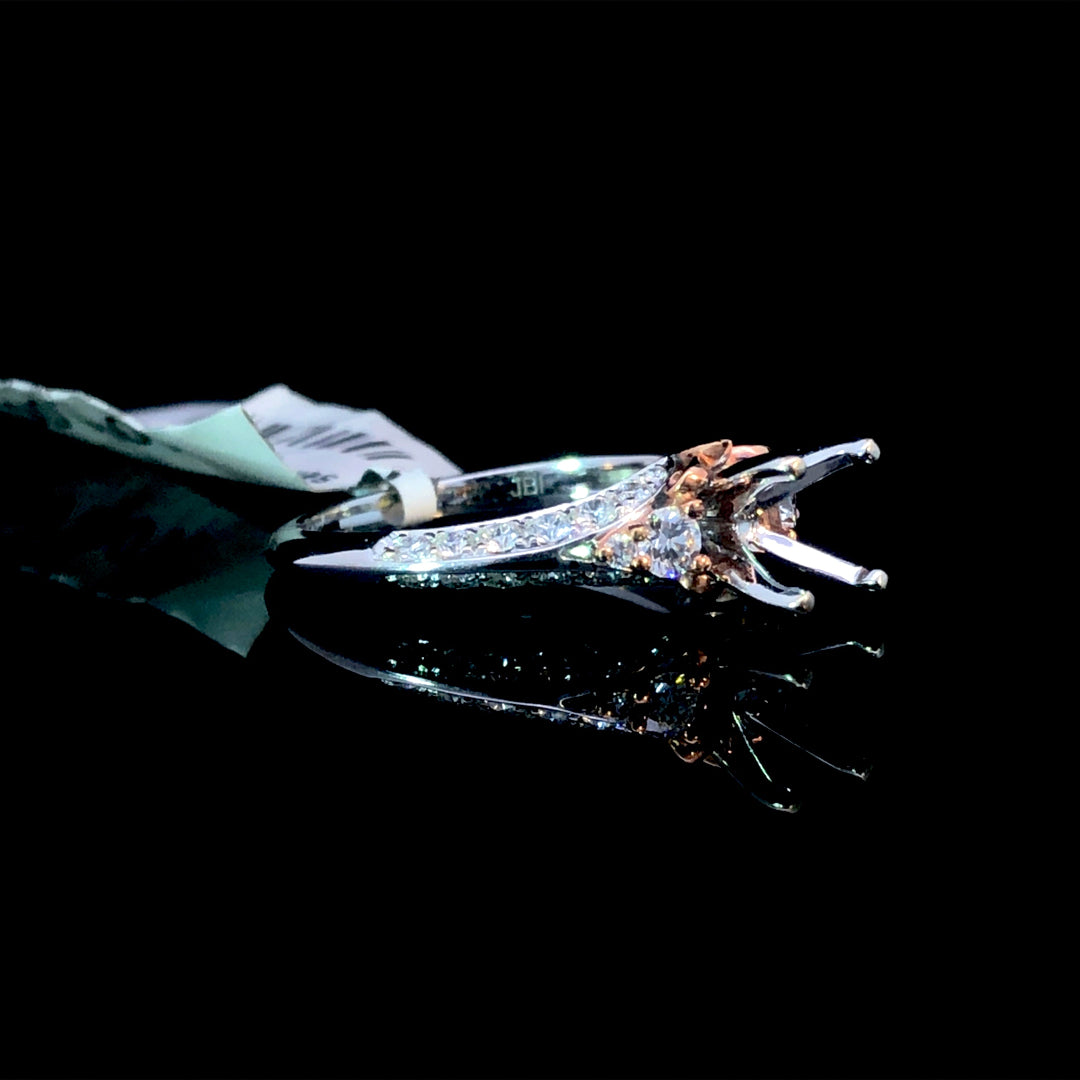 This exquisite 14kt two-tone semi-mount ring features elegant rose gold accents at the top, complemented by 0.62ctw of round diamonds that sparkle from every angle. Personalize this stunning design by selecting your ideal center stone from our curated collection of loose stones to complete a truly captivating piece. Price is for the semi mount only. Center stone will be added at an additional cost. This ring is a size 6.5. If that size is not a perfect fit, first time sizing is free at the time of purchase. Additional sizing fees may apply.