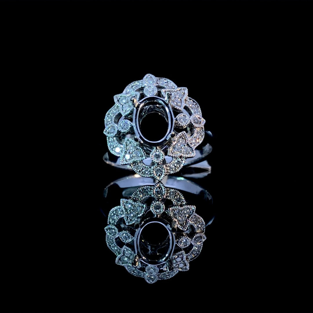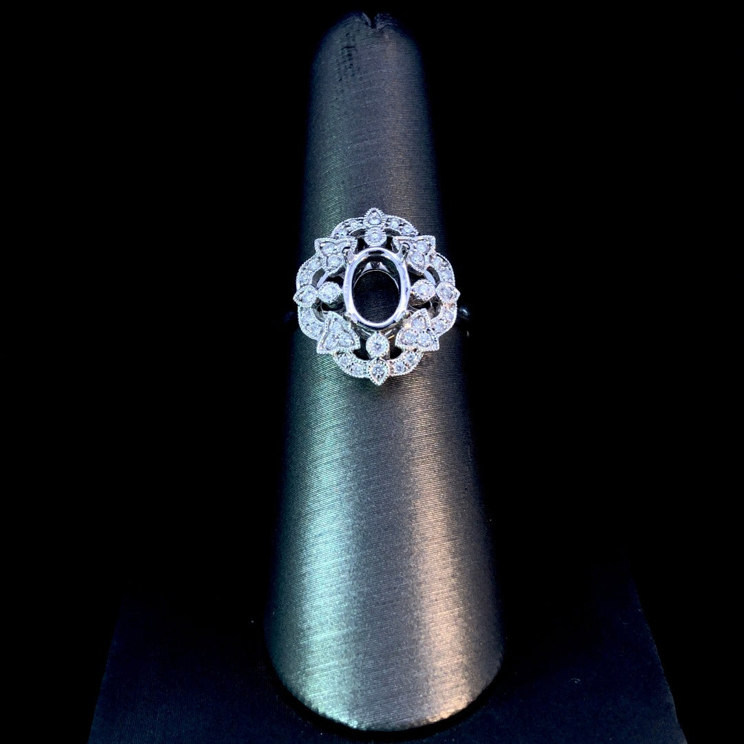 This luxurious semi mount stuns with a glittering halo of round diamonds artfully set in 14kt white gold, offering a luxurious accent to the oval center stone of your selection. Reveal your unique style with 0.25ctw of sparkling brilliance. Price is for the semi mount only. Center stone will be added at an additional cost. This ring is a size 6.5. If that size is not a perfect fit, first time sizing is free at the time of purchase. Additional sizing fees may apply.