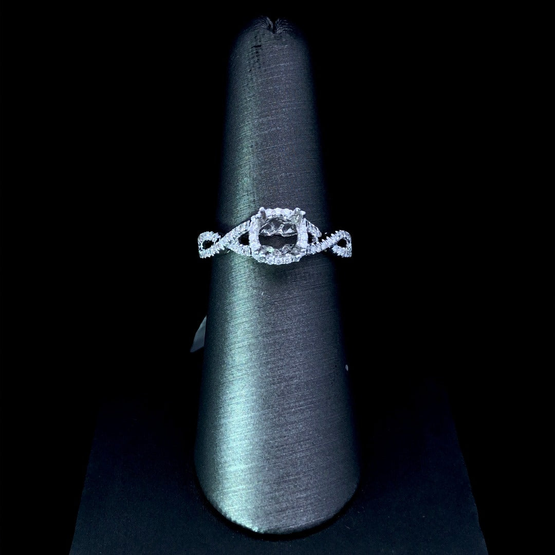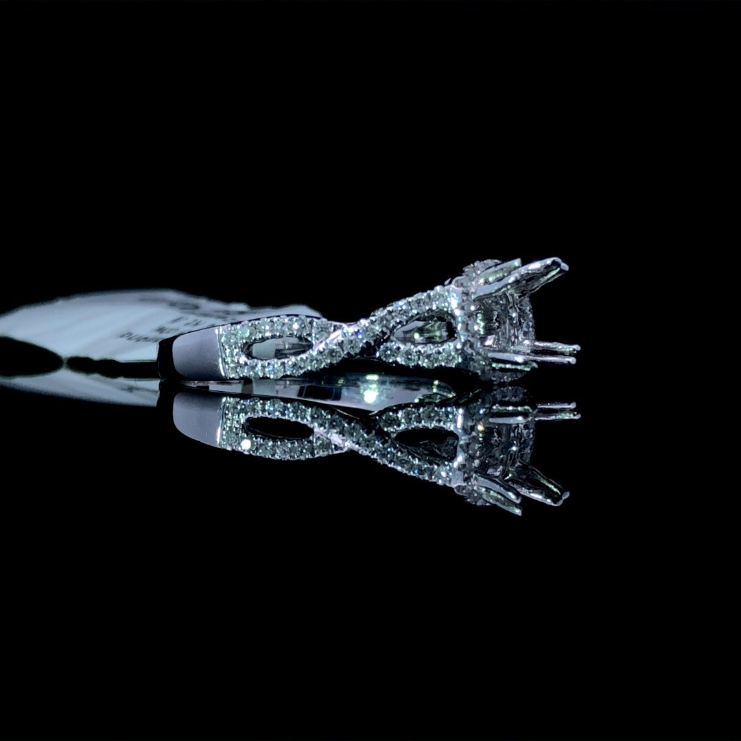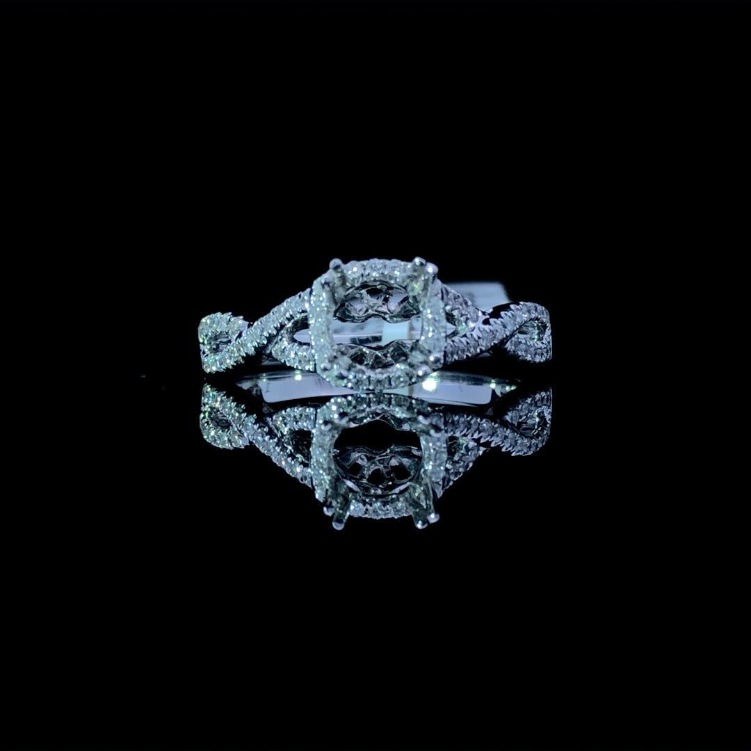 Elevate your style and dazzle with this stunning 14kt white gold diamond semi mount. Featuring a carefully crafted halo and intricate diamond detail down the twisted band, this piece offers .45ctw of sparkle. Customize with your chosen center stone and bask in the beauty of this timeless design. Price is for the semi mount only. Center stone will be added at an additional cost. This ring is a size 6.5. If that size is not a perfect fit, first time sizing is free at the time of purchase. Additional sizing fees may apply.