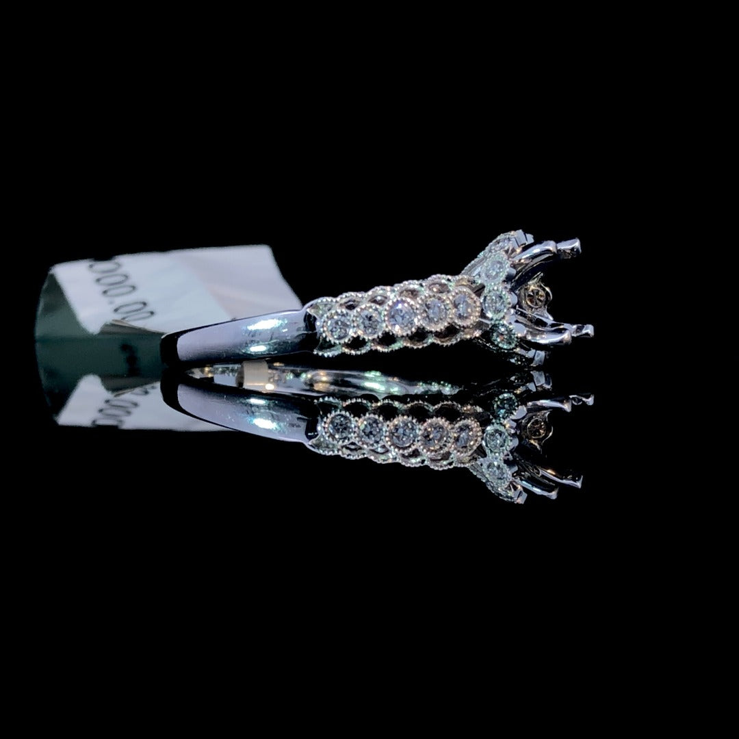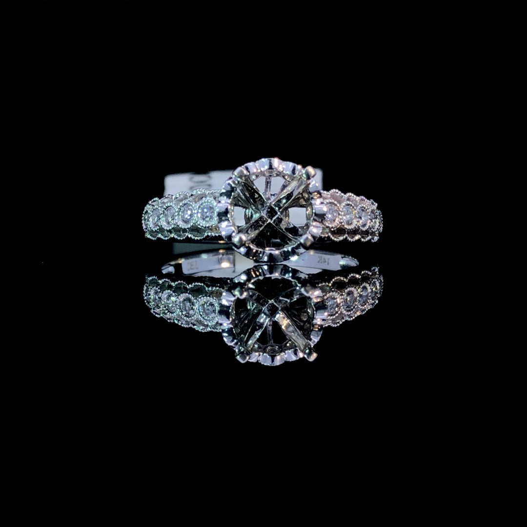Create a one-of-a-kind masterpiece with our gorgeous diamond semi mount ring. Crafted in 14kt white gold, it showcases a unique design adorned with .36ctw of sparkling round diamonds and intricate milgrain detailing. Personalize it with a center stone of your choice from our wide selection. Make a statement with this exquisite piece! Price is for the semi mount only. Center stone will be added at an additional cost. This ring is a size 6.5. If that size is not a perfect fit, first time sizing is free at the time of purchase. Additional sizing fees may apply.