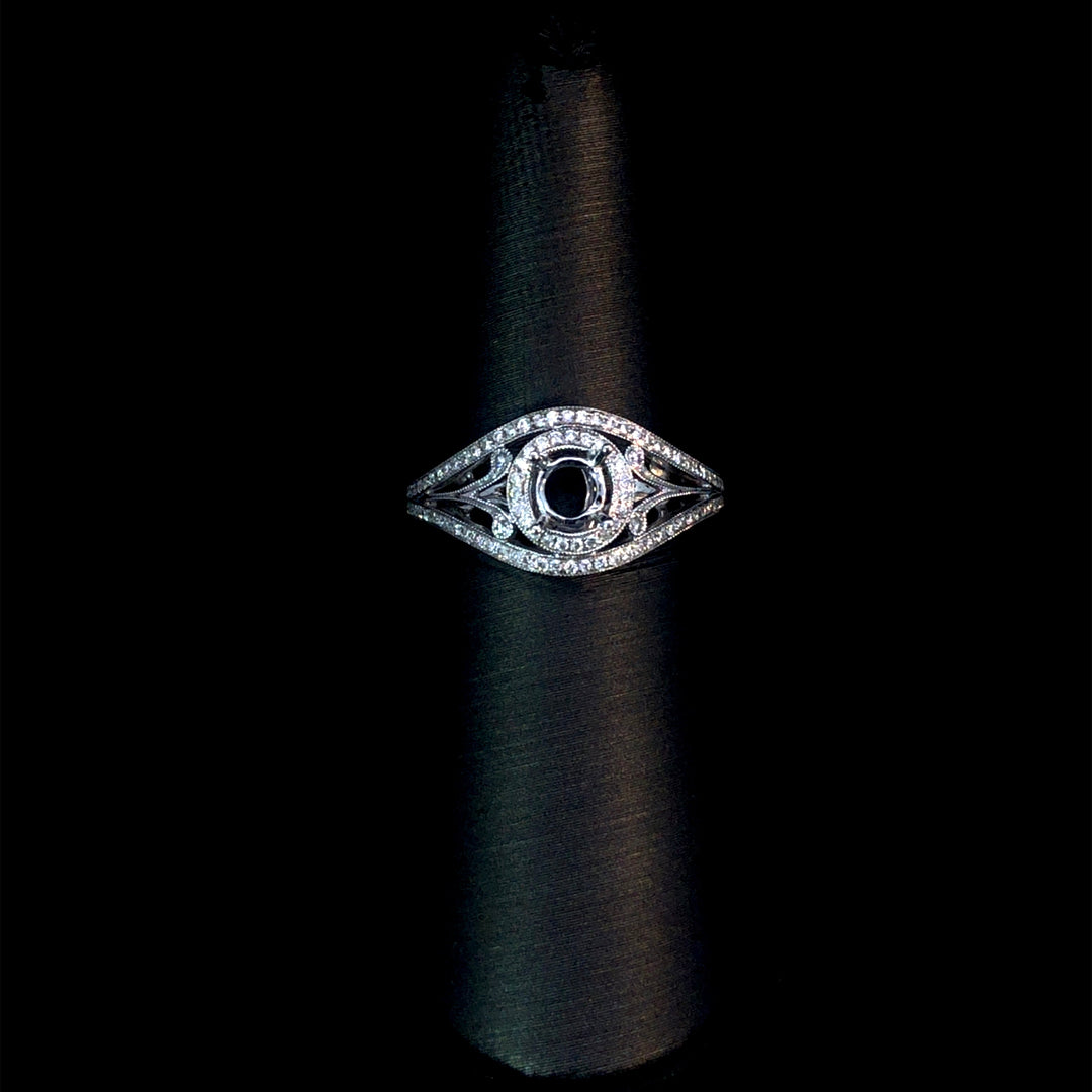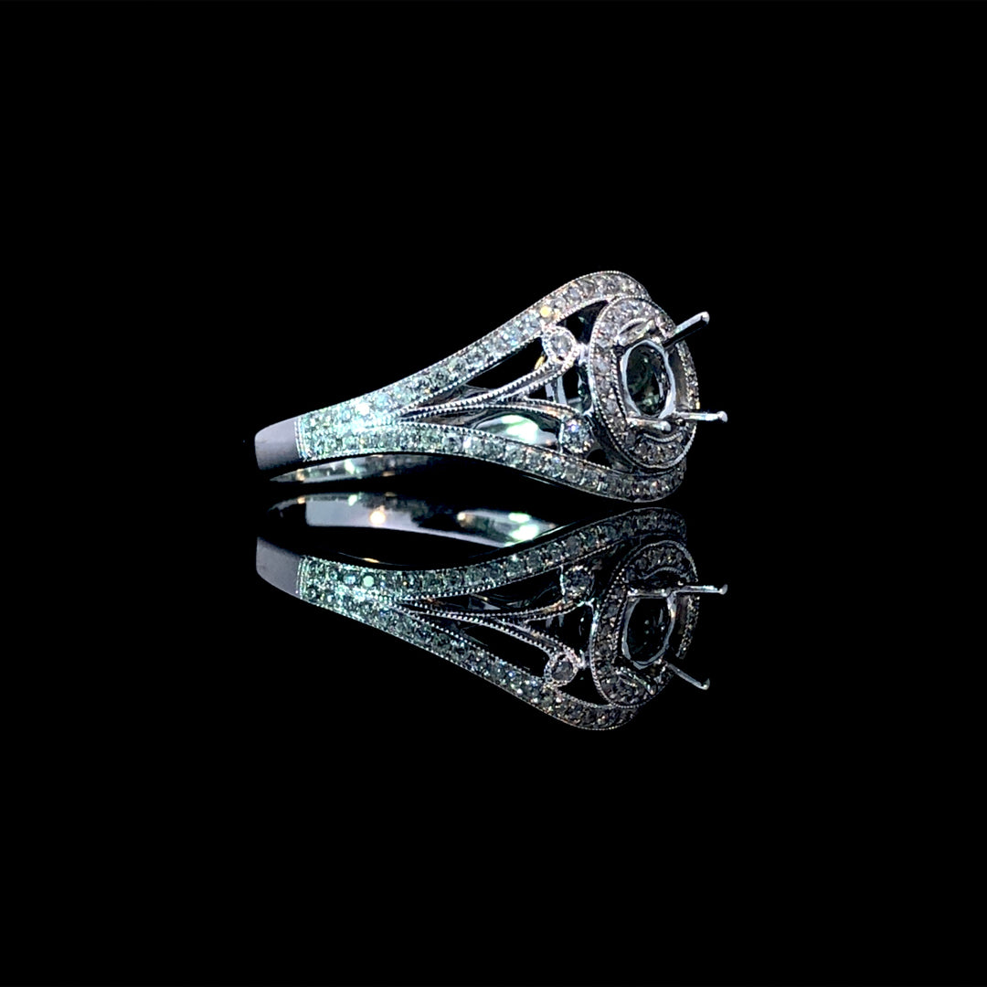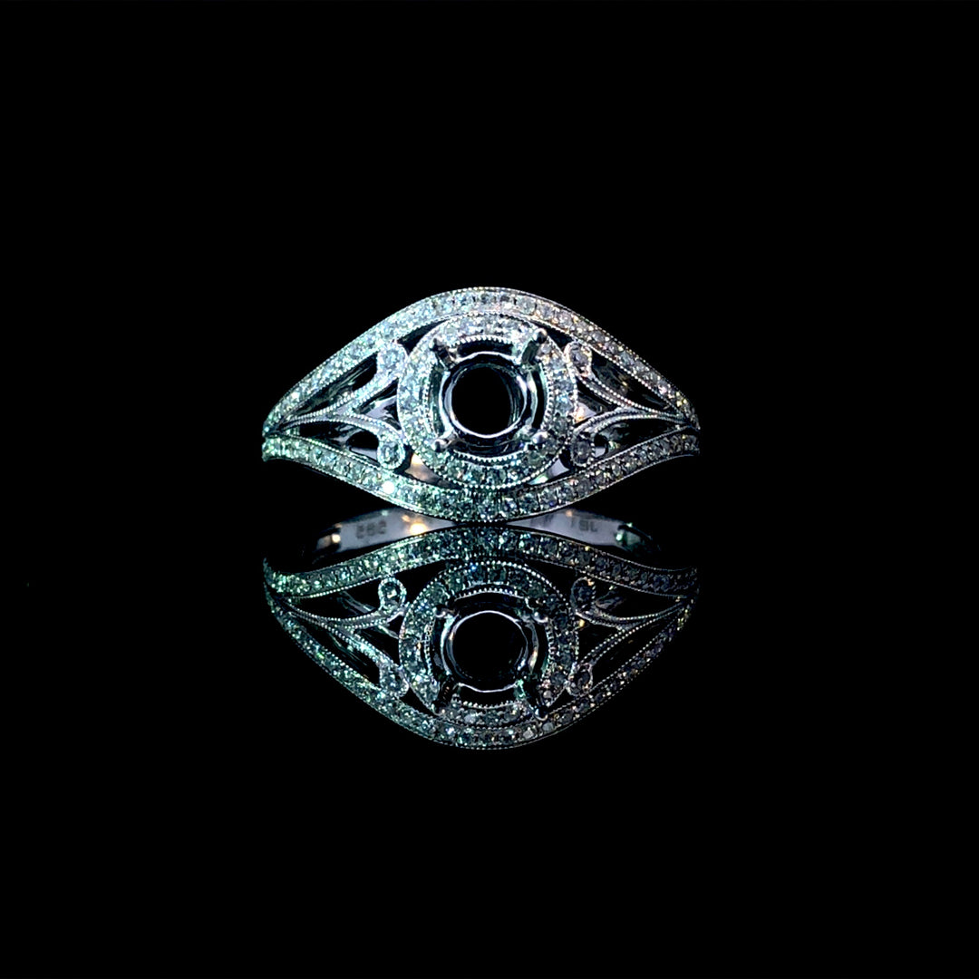 This beautiful diamond semi-mount features a decorative design with a round halo set with .30 ctw of round diamonds in 14kt white gold. Customize this elegant piece by adding your preferred center stone from our extensive collection of loose diamonds, creating a personalized statement ring that reflects your unique style. This ring is a size 6.5. If that size is not a perfect fit, first time sizing is free at the time of purchase. Additional sizing fees may apply.