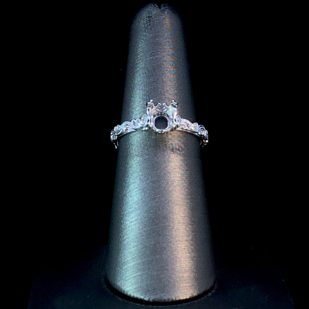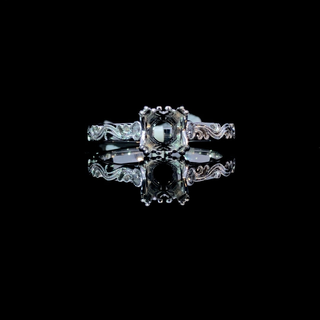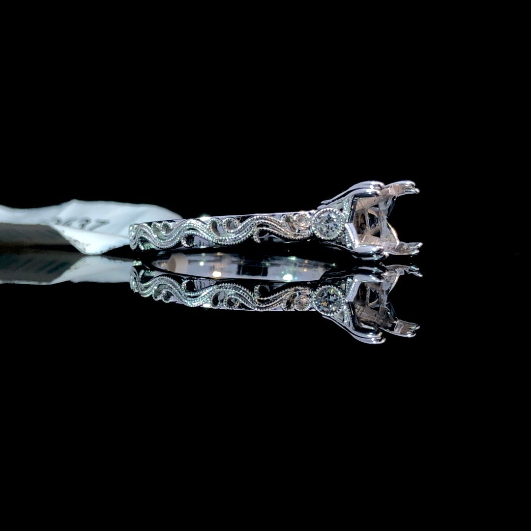 A stunningly crafted creation, this semi mount ring is an exquisite expression of elegance and timeless beauty. Crafted from luxurious 14kt white gold, the raised curved milgrain design is further enriched with two bezel-set round diamonds that total 0.05ctw. From this exquisite base, choose your own center stone to complete this stunningly exquisite piece. Price is for the semi mount only. Center stone will be added at an additional cost. This ring is a size 6.5. If that size is not a perfect fit, first time sizing is free at the time of purchase. Additional sizing fees may apply.