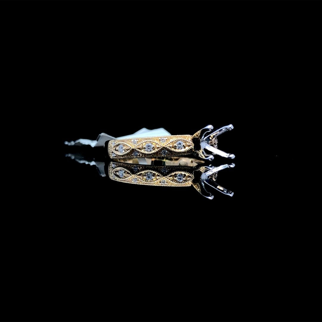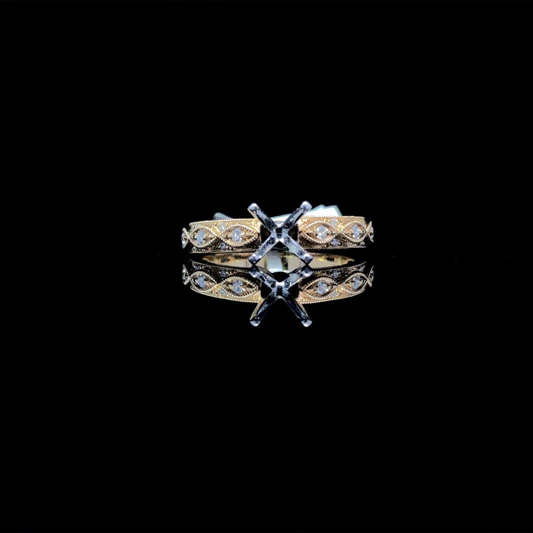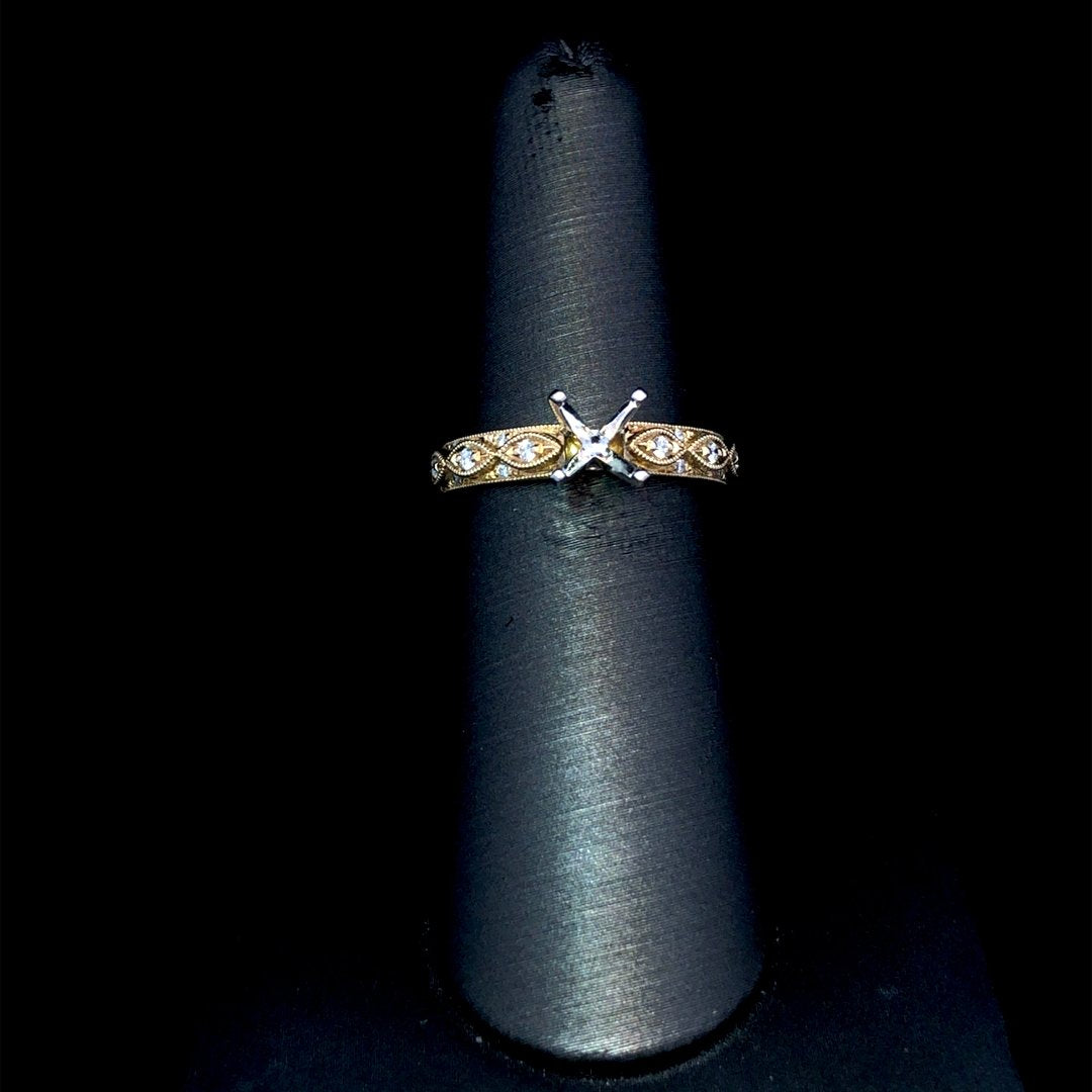 Enhance your style with this stunning diamond semi mount. Crafted in 14kt yellow gold with an intricate design, .15ctw of round diamonds, and milgrain details. Customize it with your perfect chosen center stone from our unmatched loose stone collection! Price is for the semi mount only. Center stone will be added at an additional cost. This ring is a size 6.5. If that size is not a perfect fit, first time sizing is free at the time of purchase. Additional sizing fees may apply.