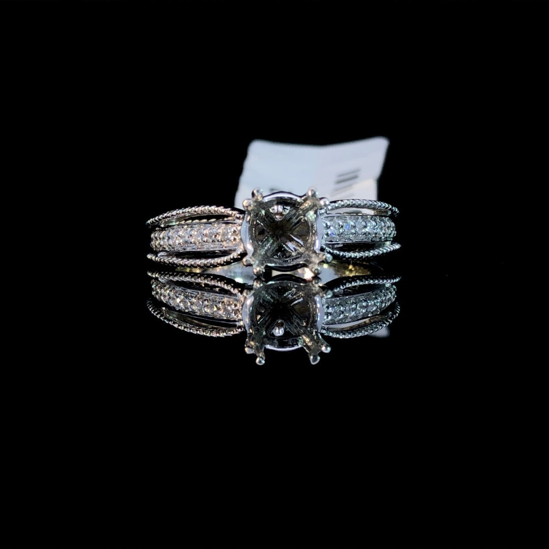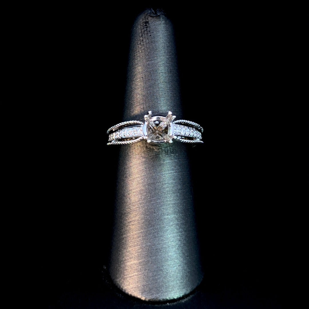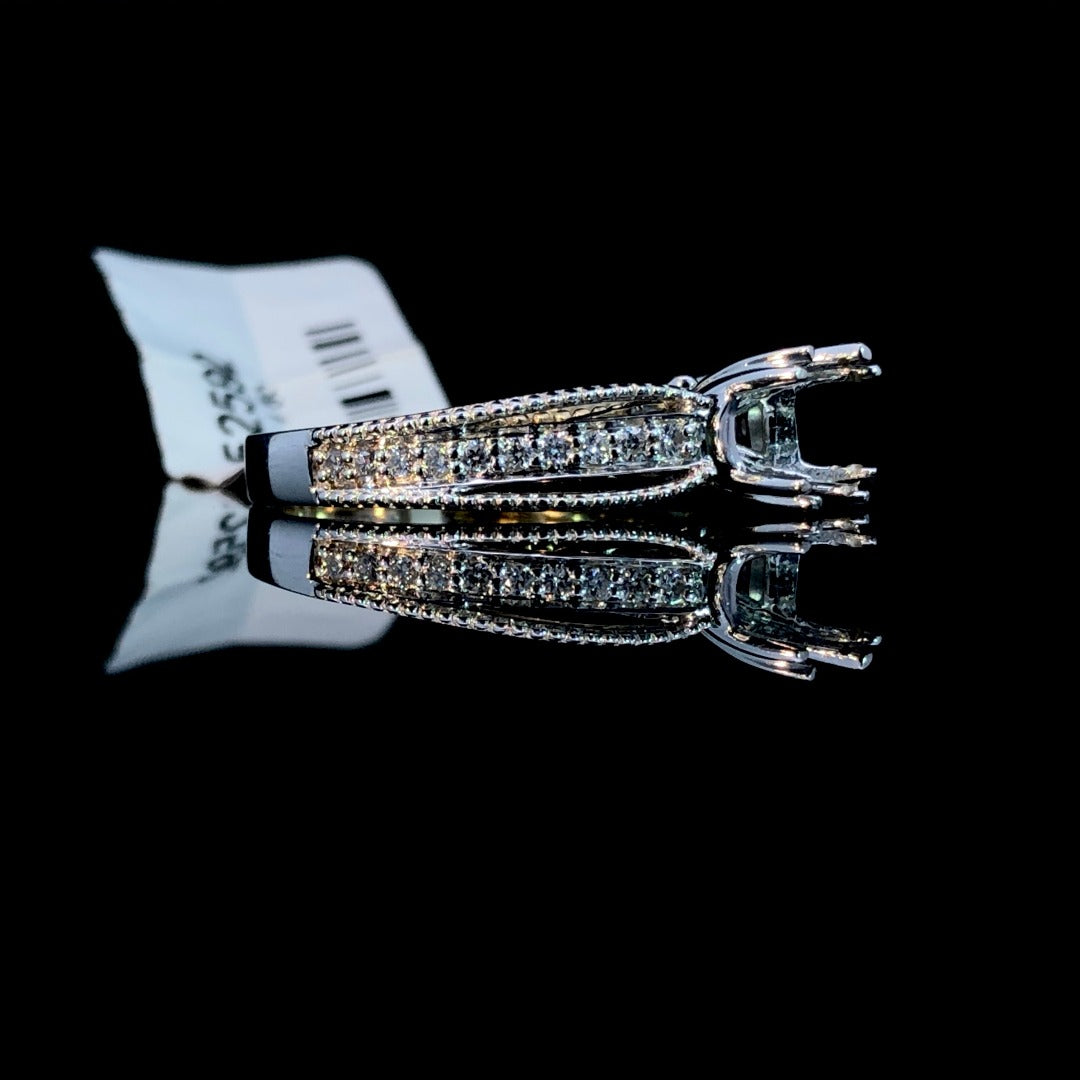 Indulge in luxury with this chic diamond semi mount. The 14kt white gold band boasts .19ctw of round diamonds, accented with a milgrain swirl. Inside, yellow gold milgrain adds a touch of warm elegance. Choose from our exquisite loose stone collection to complete this timeless piece. Price is for the semi mount only. Center stone will be added at an additional cost. This ring is a size 6.5. If that size is not a perfect fit, first time sizing is free at the time of purchase. Additional sizing fees may apply.