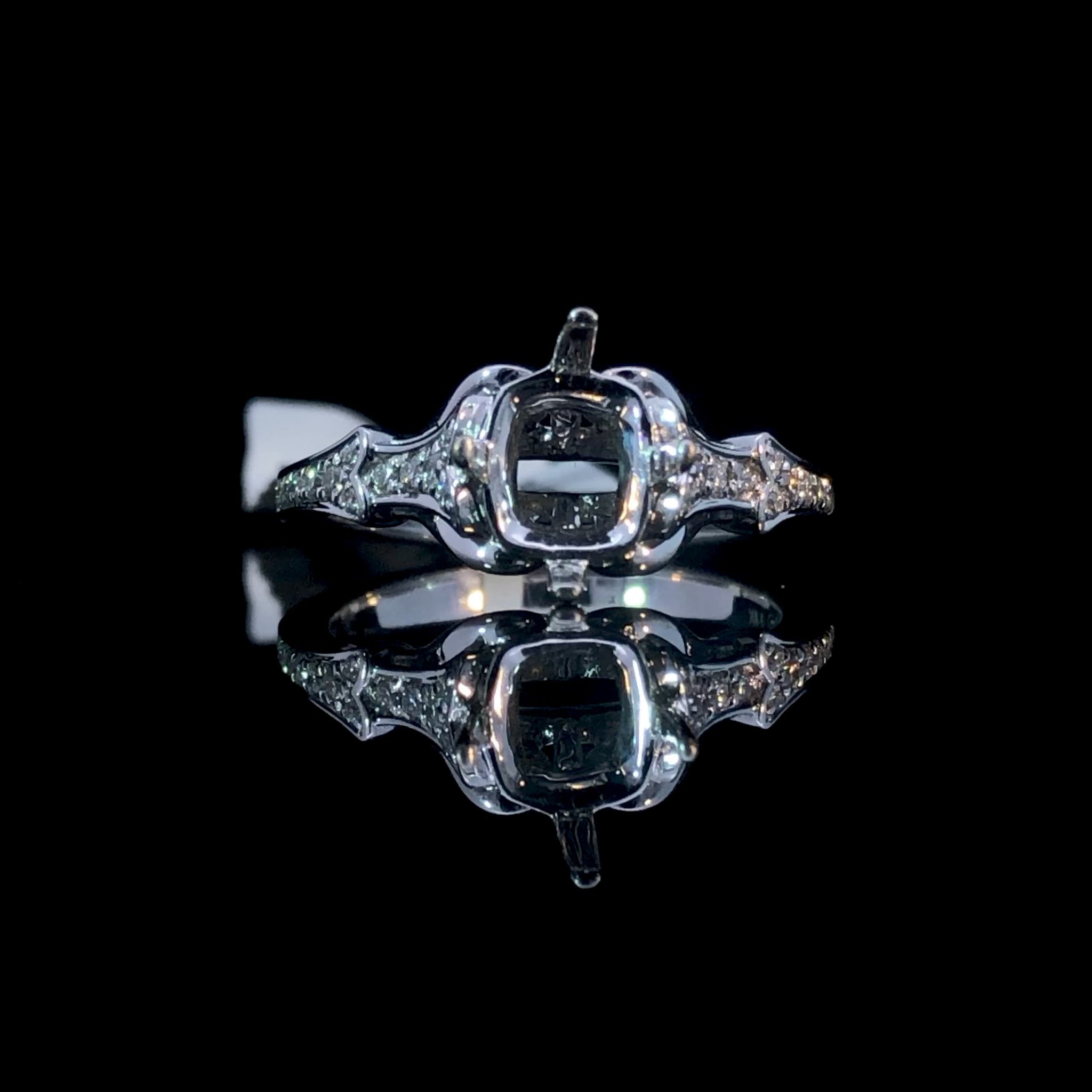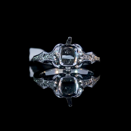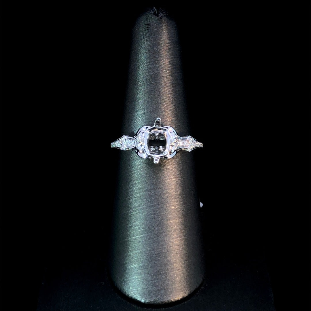 Adorn yourself with this stunning diamond semi mount! Crafted in 14kt white gold, it features a decorative design set with .16ctw of diamonds to create a look that will dazzle. Make a lasting impression with this beautiful diamond masterpiece! Price is for the semi mount only. Center stone will be added at an additional cost. This ring is a size 7. If that size is not a perfect fit, first time sizing is free at the time of purchase. Additional sizing fees may apply.