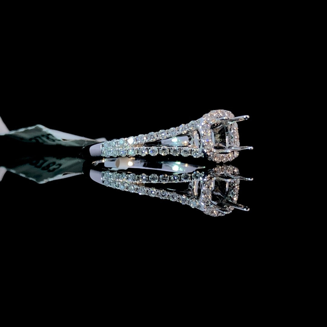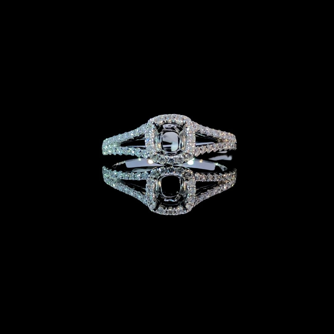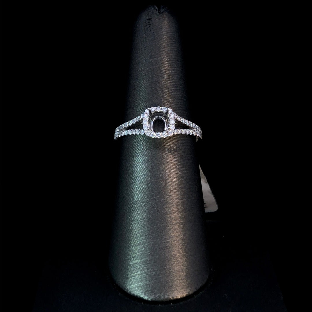 Accentuate your bride's effortless beauty with our classic diamond semi mount, featuring a cushion-shaped halo and a split shank band adorned with round diamonds (.39ctw). Crafted in 14kt white gold, choose from our collection of center stones to create a truly customizable piece. Price is for the semi mount only. Center stone will be added at an additional cost. This ring is a size 6.5. If that size is not a perfect fit, first time sizing is free at the time of purchase. Additional sizing fees may apply.