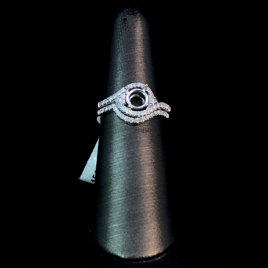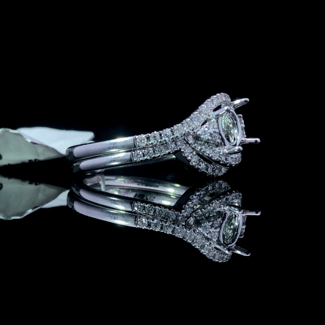 Indulge in luxury with our exquisite diamond semi mount set. The round diamond band gracefully swirls around the head, creating a halo effect. On either side, a cluster of 3 round diamonds arranged in a trillion shape adds a unique touch. Choose from our unmatched selection of loose stones to set at the center. This 14kt white gold set, complete with a matching diamond contour band, boasts a total weight of .33ctw. Elevate your style with this sophisticated and exclusive set. Price is for the semi mount and band only. Center stone will be added at an additional cost. This ring is a size 6.5. If that size is not a perfect fit, first time sizing is free at the time of purchase. Additional sizing fees may apply.