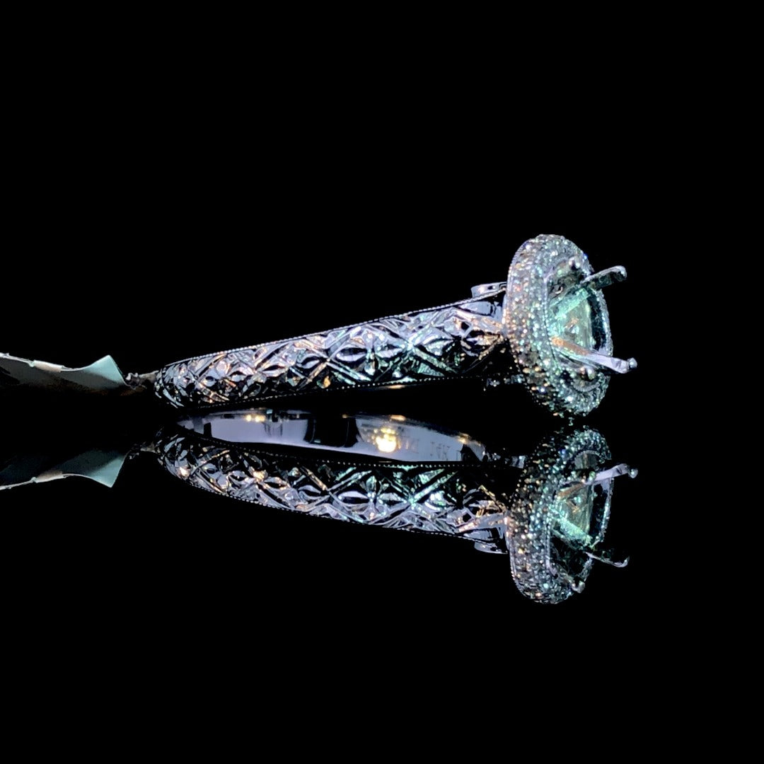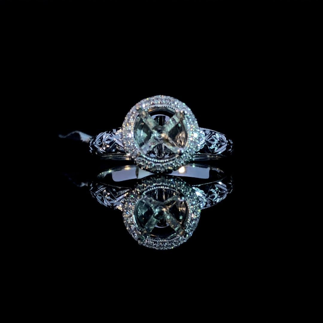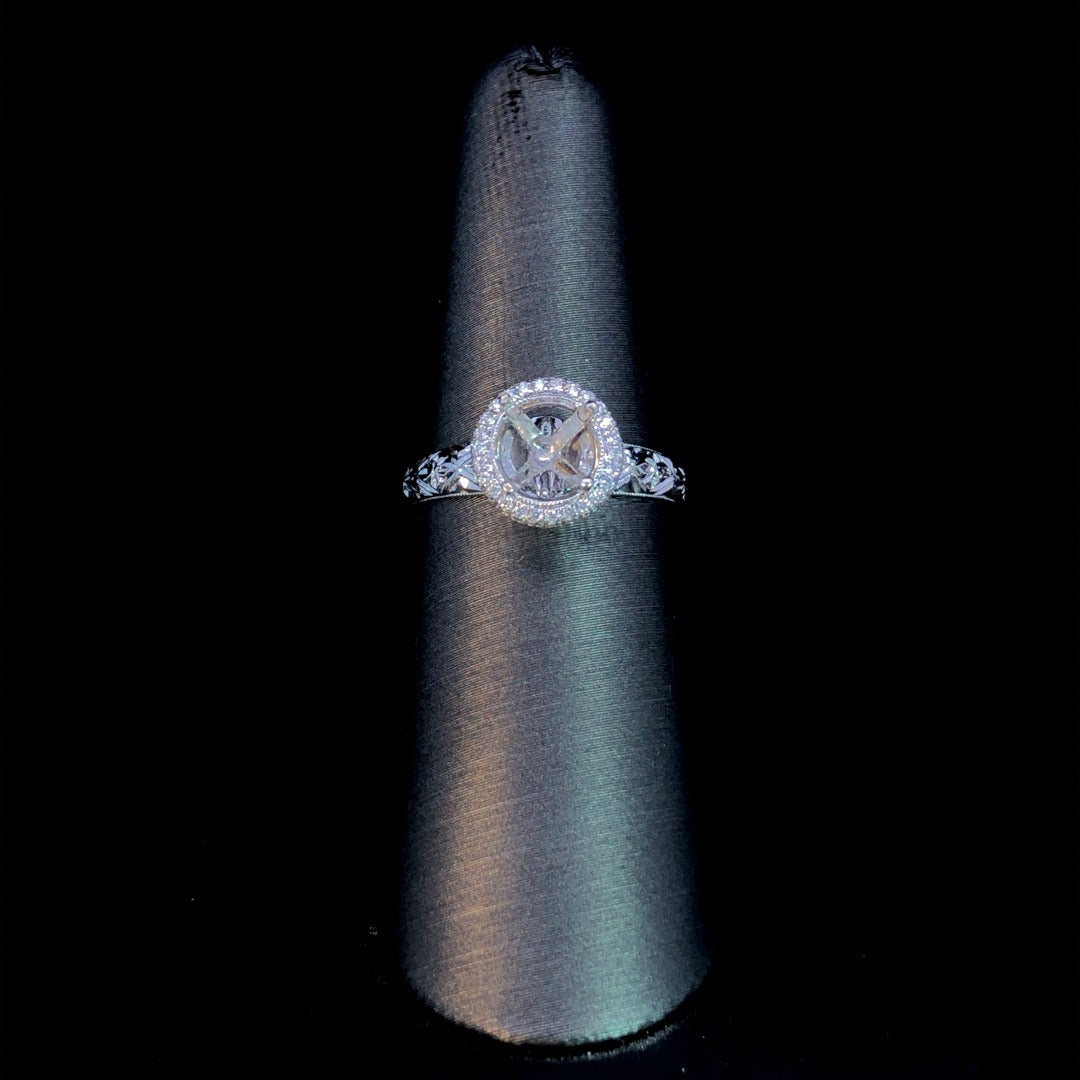 Transform any diamond into a stunning masterpiece with our 14kt white gold semi mount. Featuring a .19ctw diamond halo and intricately etched band, this piece exudes elegance and luxury. Elevate your style with your choice of center stone from our exclusive collection of loose stones. Price is for the semi mount only. Center stone will be added at an additional cost. This ring is a size 6.5. If that size is not a perfect fit, first time sizing is free at the time of purchase. Additional sizing fees may apply.