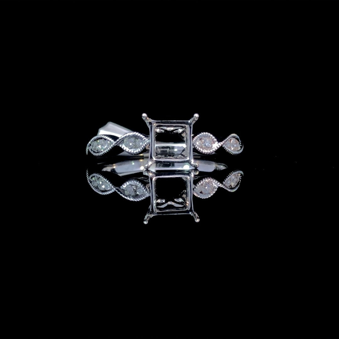 This exquisite ring boasts a stunning twist style band adorned with .16ctw of brilliant round diamonds and delicate milgrain accents. Made from luxurious 14kt white gold, this piece also allows you to select your own center stone from our extensive range of loose stones for a truly customized look. Price is for the semi mount only. Center stone will be added at an additional cost. This ring is a size 6.5. If that size is not a perfect fit, first time sizing is free at the time of purchase. Additional sizing fees may apply.