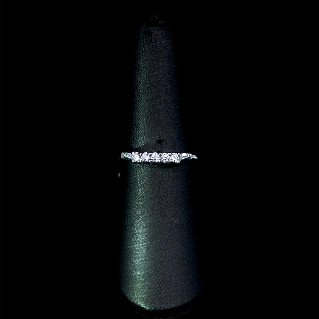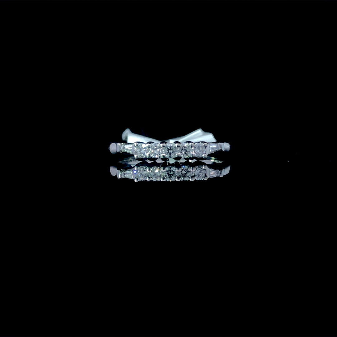 Upgrade your jewelry collection with this stunning diamond contour band. Crafted in 14kt white gold, this band features a sparkling .33ctw of round and baguette diamonds that will add a touch of elegance and luxury to any outfit. Treat yourself or surprise a loved one with this timeless and exquisite piece. This ring is a size 7. If that size is not a perfect fit, first time sizing is free at the time of purchase. Additional sizing fees may apply.
