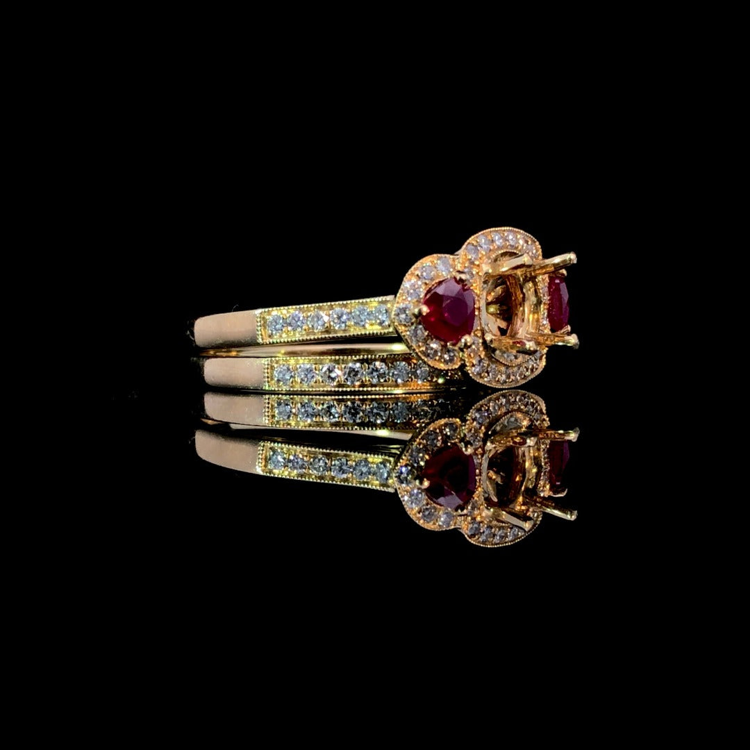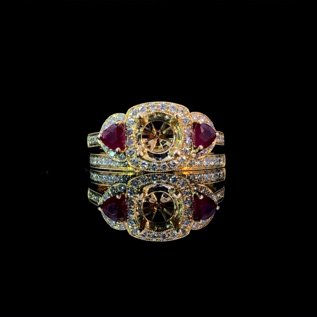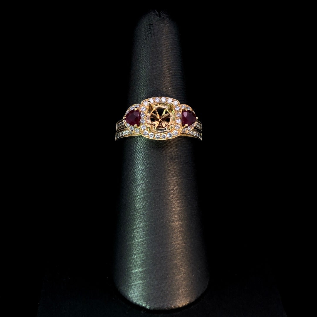 Indulge in luxury with this regal set. Adorned with a halo design and 2 rubies on the sides totaling .56ctw, it boasts round diamonds around the center and down the band, for a total weight of 1.12ctw of diamonds and rubies. Complete the look with a center stone of your choice from our exquisite collection. Price is for the semi mount only. Center stone will be added at an additional cost. This ring is a size 6.5. If that size is not a perfect fit, first time sizing is free at the time of purchase. Additional sizing fees may apply.