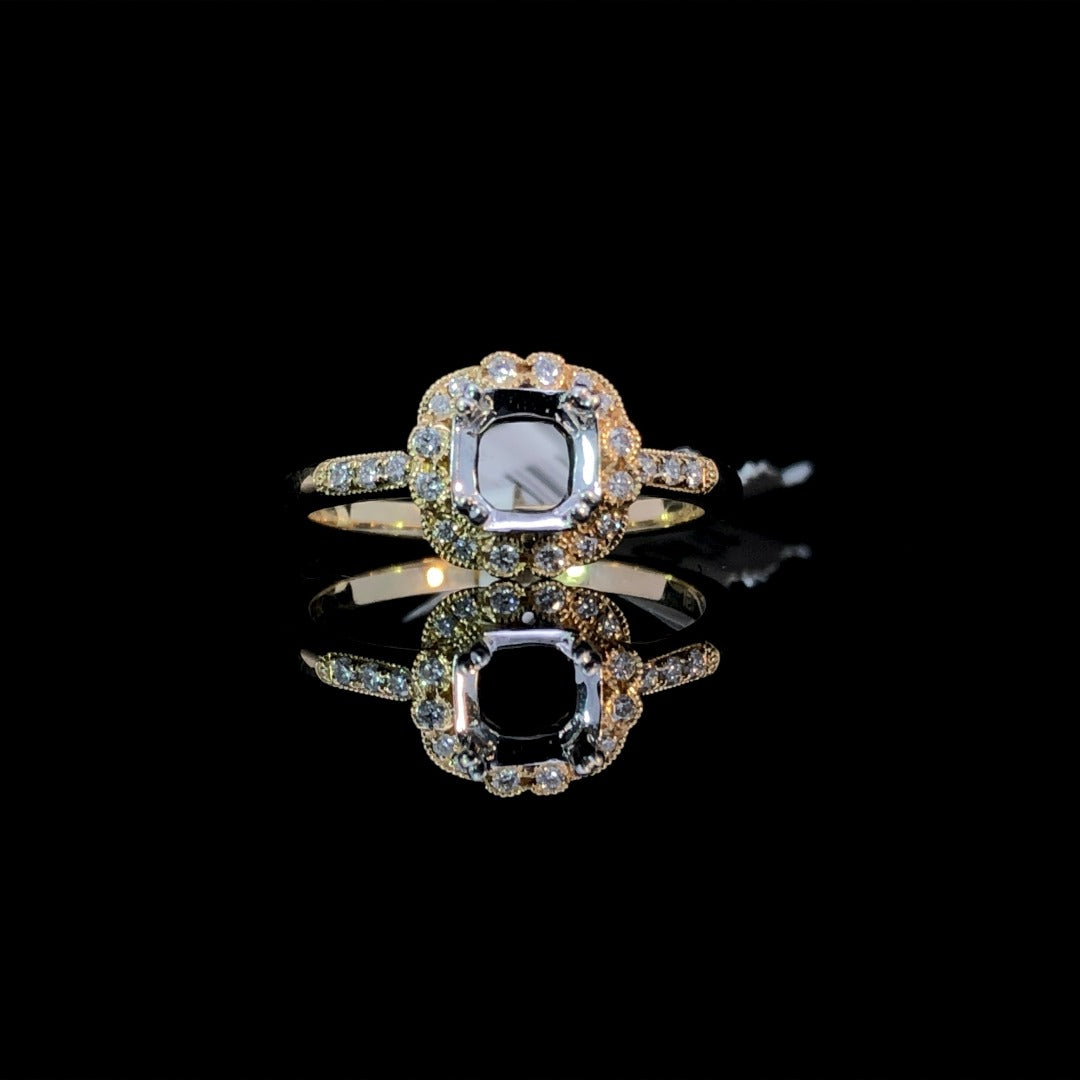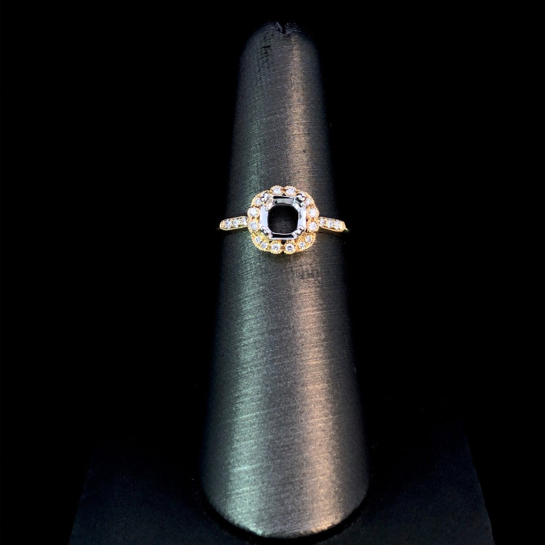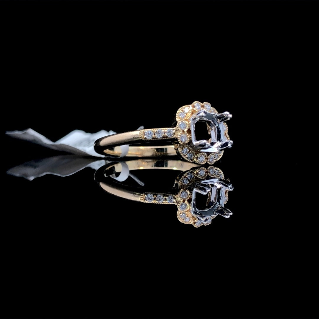 Elevate your bridal look with this gorgeous diamond semi mount. Crafted in luxurious 14kt yellow gold, a stunning halo of round diamonds and a band adorned with additional diamonds (.17ctw) create sophisticated glamour. Personalize it with your choice of center stone, expertly set and custom sized for you by our in-house jewelers. Price is for the semi mount only. Center stone will be added at an additional cost. This ring is a size 6. If that size is not a perfect fit, first time sizing is free at the time of purchase. Additional sizing fees may apply.