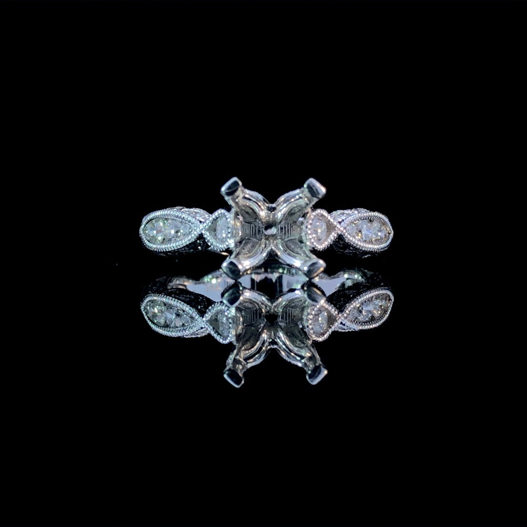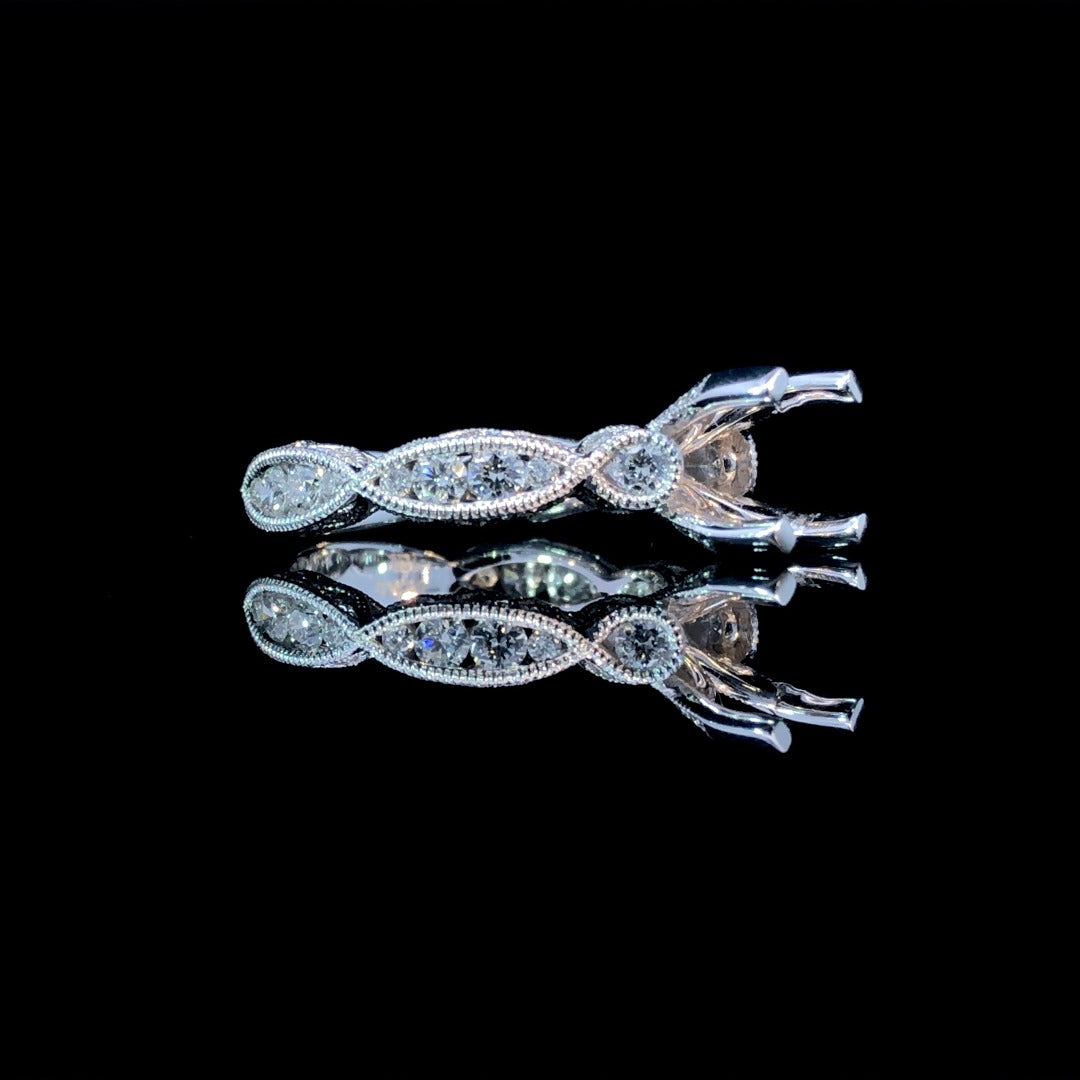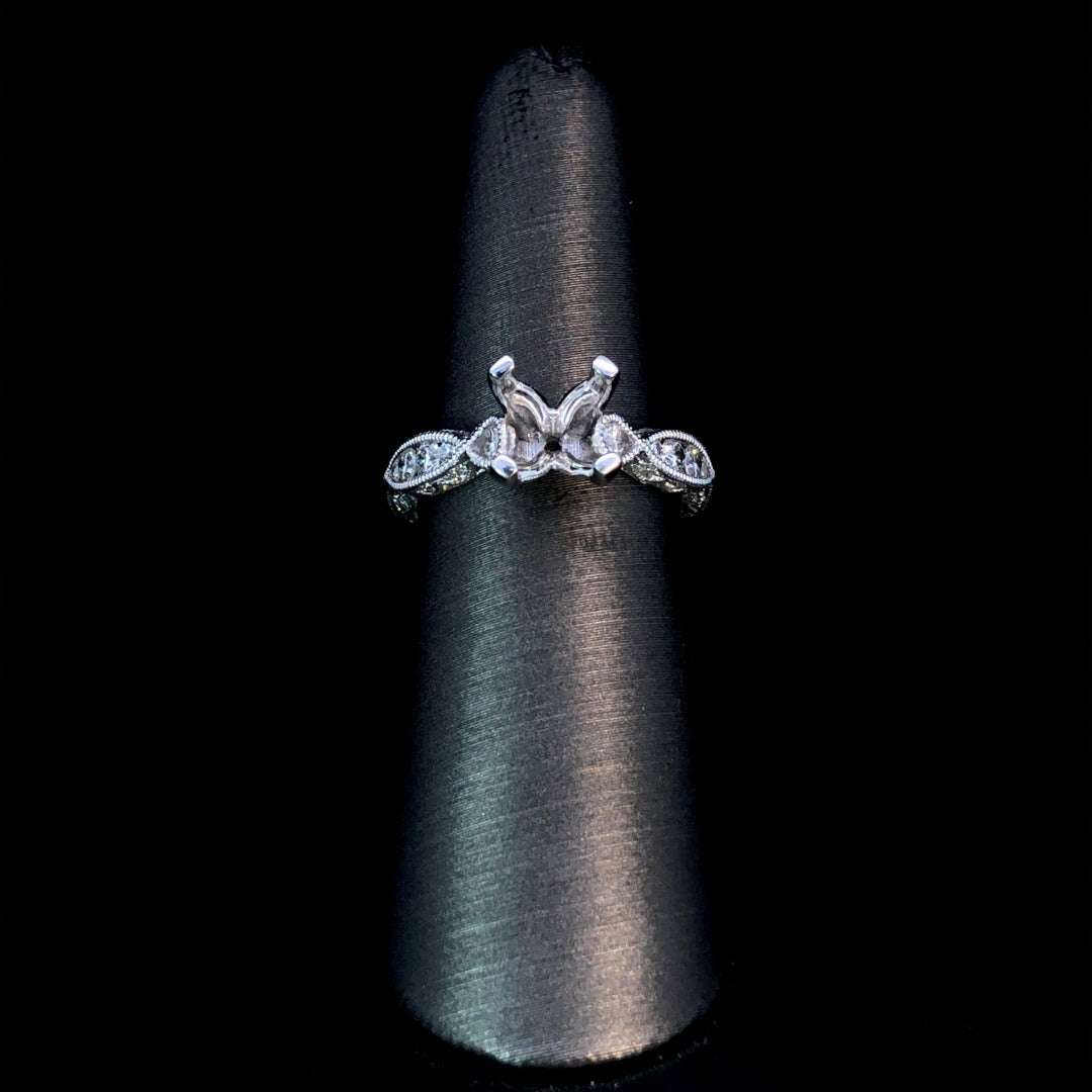 Introducing a stunning diamond semi mount that is a true work of art. This piece features a decorative band with round diamonds, intricate milgrain detailing, and additional diamonds all around for a total weight of .88ctw. Add your own center stone and shine like never before! Price is for the semi mount only. Center stone will be added at an additional cost. This ring is a size 6.5. If that size is not a perfect fit, first time sizing is free at the time of purchase. Additional sizing fees may apply.