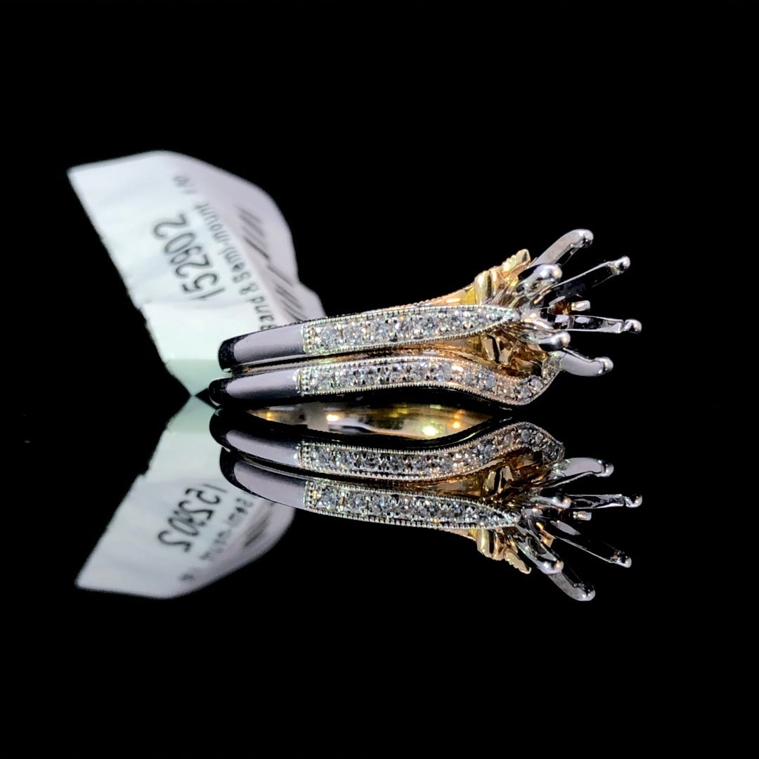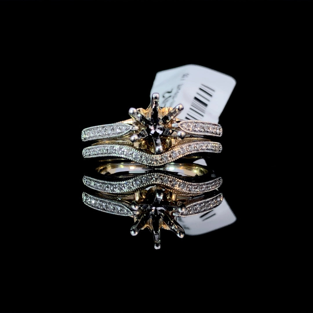 Indulge in pure elegance with this gorgeous diamond set! Featuring a stunning semi with .11ctw of sparkling round diamonds and a place to hold your desired center stone. Matched perfectly with a .12ctw diamond contour band, this 14kt 2-tone gold set is sure to turn heads. Upgrade your jewelry collection today! Price is for the semi and band only. Center stone will be added at an additional cost. This is a size 6. If that size is not a perfect fit, first time sizing is free at the time of purchase. Additional sizing fees may apply.
