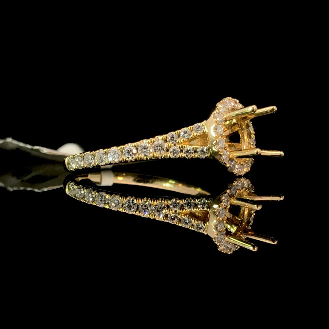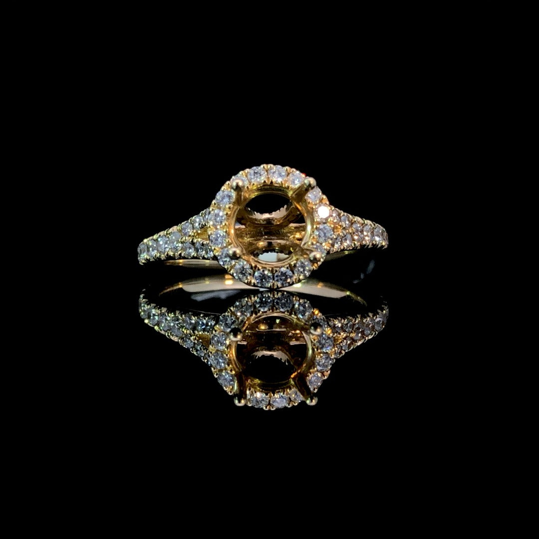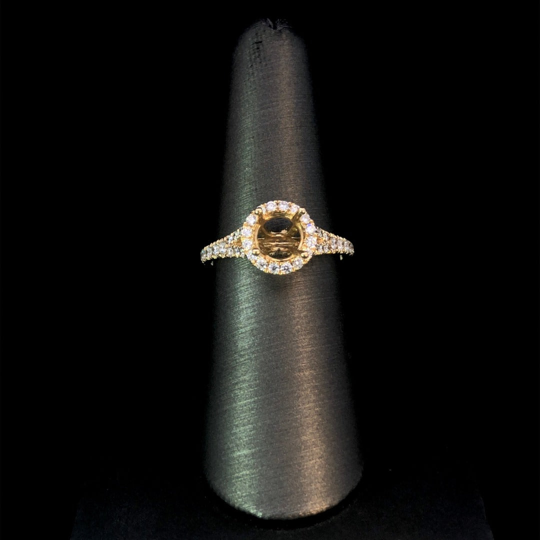 Experience the perfect blend of classic and modern with this beautiful diamond semi mount. The round halo design and split shank showcase .62ctw of round diamonds set in 14kt yellow gold. Create a truly unique piece by selecting your own center stone from our wide range of options. Price is for the semi mount only. Center stone will be added at an additional cost. This ring is a size 7. If that size is not a perfect fit, first time sizing is free at the time of purchase. Additional sizing fees may apply.