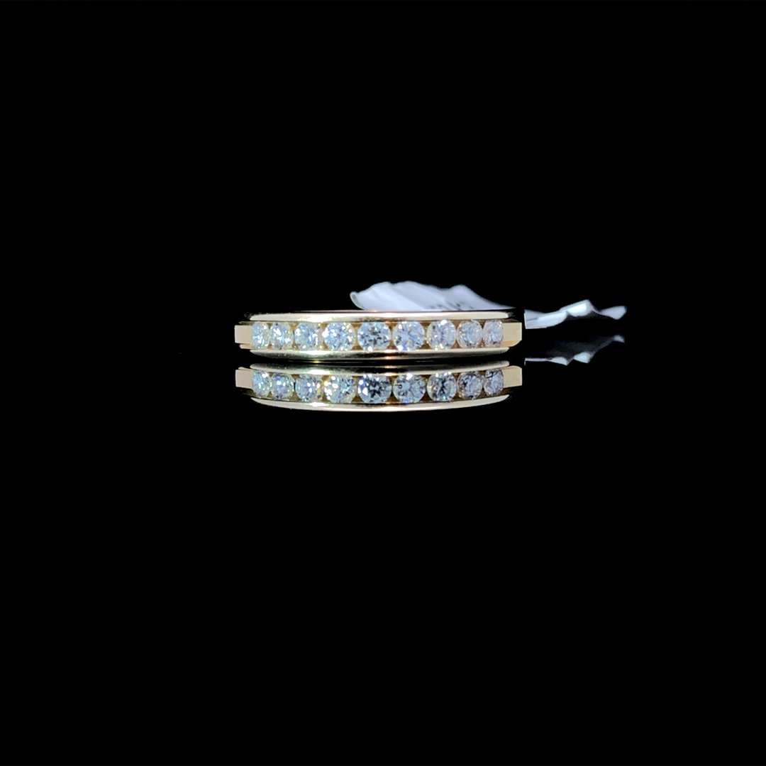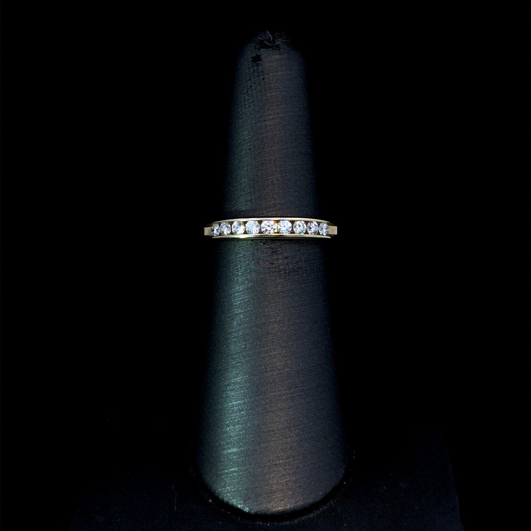 Indulge timeless elegance with this diamond band. Crafted in 14kt yellow gold, this luxurious piece features a channel-set of sparkling, round diamonds totaling .30ctw. Elevate your style with this classic and sophisticated addition to your jewelry collection. This ring is a size 6. If that size is not a perfect fit, first time sizing is free at the time of purchase. Additional sizing fees may apply.
