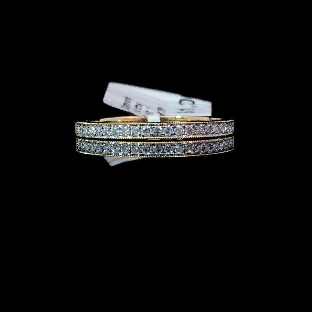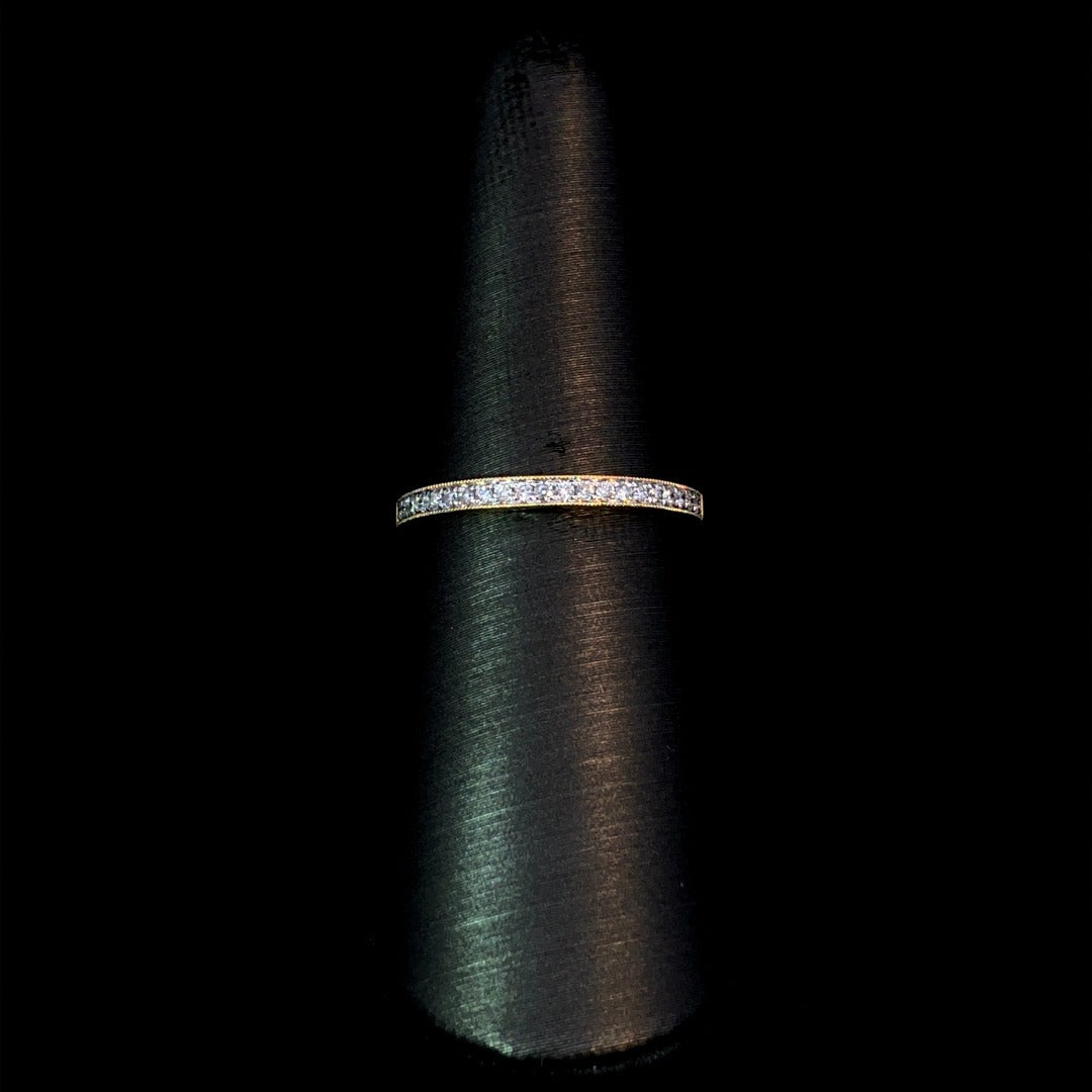 Upgrade your jewelry collection with our elegant diamond band. Made of 14kt yellow gold, this band features .14ctw of sparkling round diamonds accented by delicate milgrain detailing. Elevate any outfit with this luxurious and timeless piece. This ring is a size 6.75. If that size is not a perfect fit, first time sizing is free at the time of purchase. Additional sizing fees may apply.