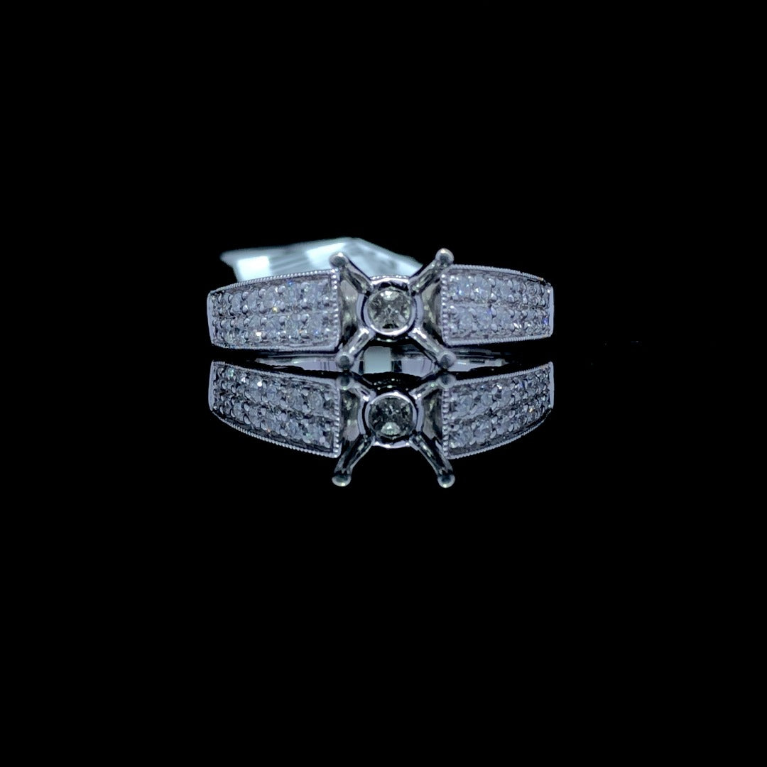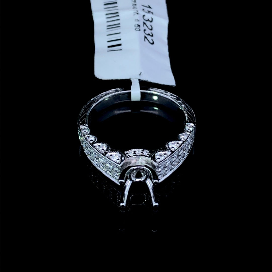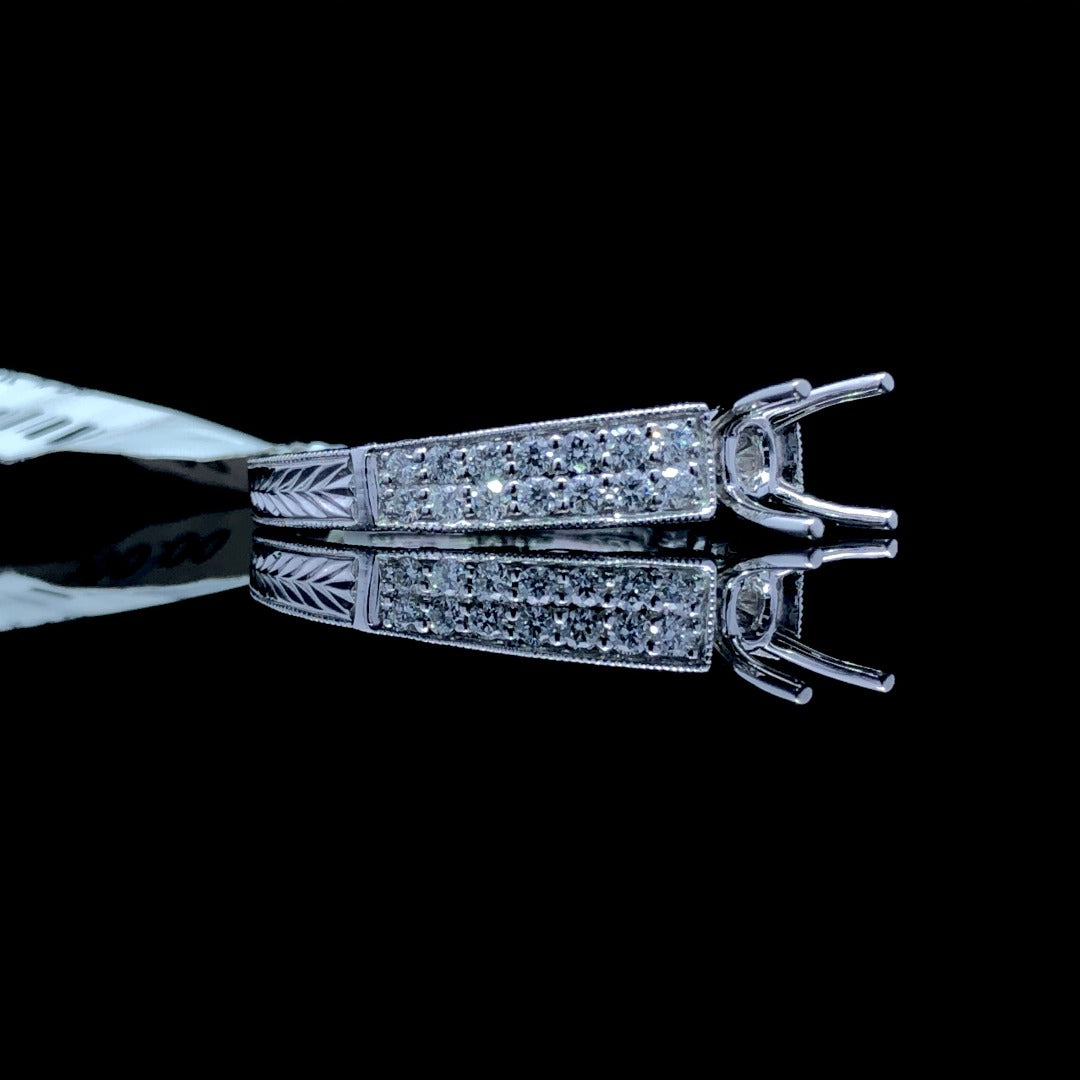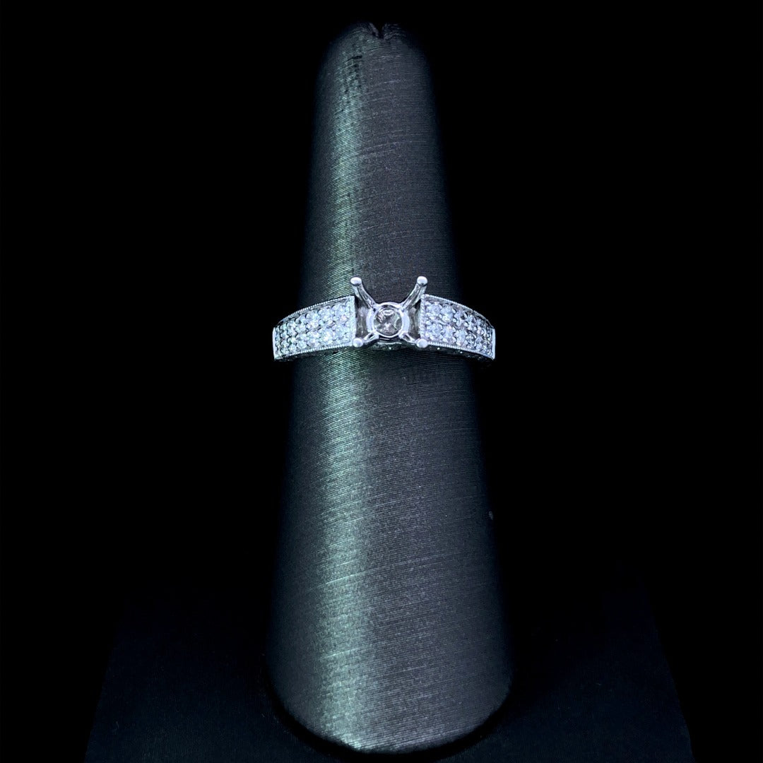 Indulge in luxury and elegance with this stunning 14kt white gold diamond semi mount. The double row of diamonds on the band, along with the scalloped sides and milgrain detailing, add a touch of sophistication. With a total diamond weight of .63ctw, this piece will truly make a statement. Complete this beautiful ring by adding the center stone of your choice from our vast selection of loose stones. Price is for the semi mount only. Center stone will be added at an additional cost. This ring is a size 6.5. If that size is not a perfect fit, first time sizing is free at the time of purchase. Additional sizing fees may apply.