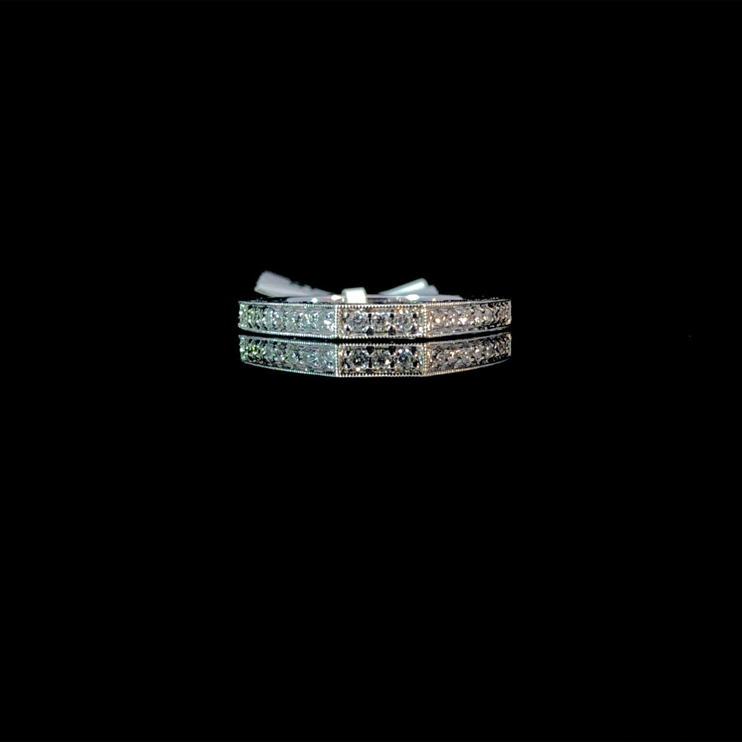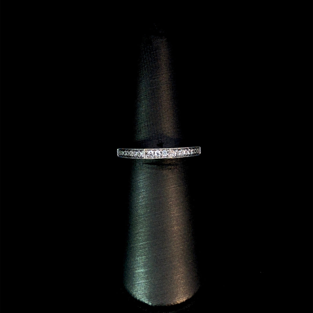 Add a touch of elegance to your look with this diamond band. The intricate design, along with .40ctw of round diamonds, etching, and milgrain detailing, make this band a perfect choice for any occasion. Crafted in 14kt white gold, it exudes luxury and sophistication. Elevate your style with this stunning piece. This ring is a size 6.5. If that size is not a perfect fit, first time sizing is free at the time of purchase. Additional sizing fees may apply.