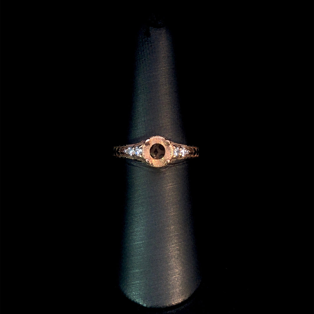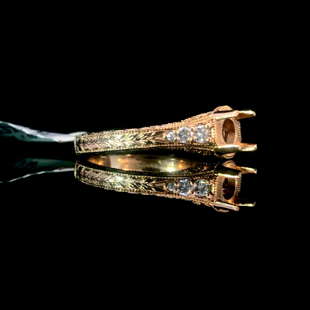 Crafted in 14kt rose gold, this elegant diamond semi-mount features space to showcase your chosen center stone from our exclusive collection of loose stones. Accented by three graduating diamonds on each side of the head, totaling .20ctw, and detailed with intricate band embellishments, this piece offers a refined and personalized expression of timeless beauty. Price is for the semi mount only. Center stone will be added at an additional cost. This ring is a size 7. If that size is not a perfect fit, first time sizing is free at the time of purchase. Additional sizing fees may apply.