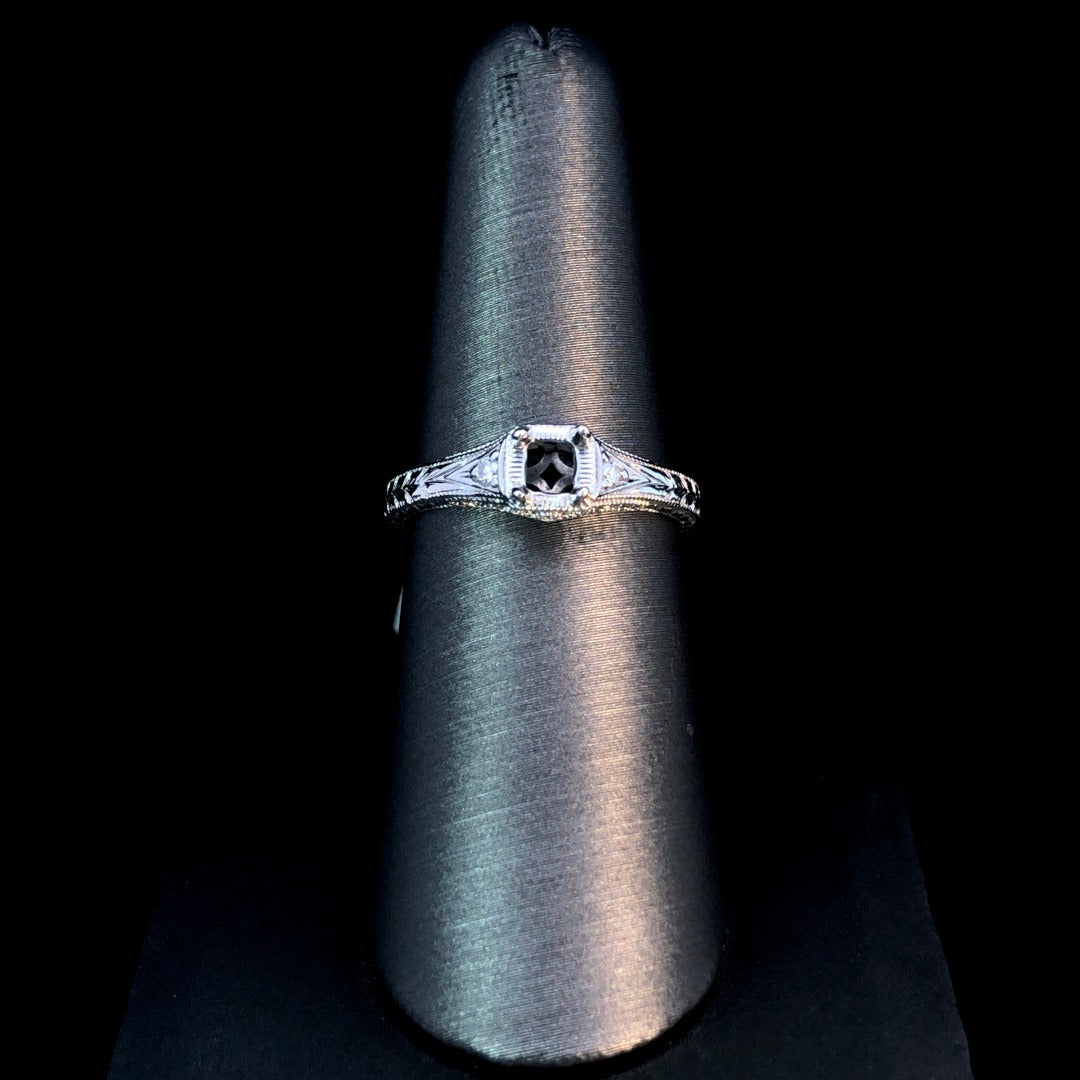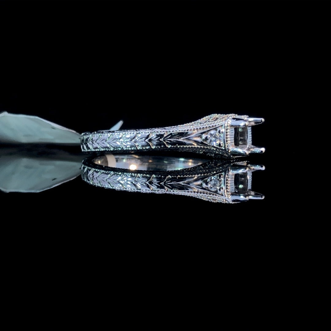 Elevate your style with this detailed semi mount. Handcrafted in 14kt white gold with intricate etching and sparkling .05ctw of round diamonds, this piece exudes luxury. Choose from our large selection of loose stones to personalize this stunning ring. Make a statement with this exclusive and timeless piece. Price is for the semi mount only. Center stone will be added at an additional cost. This ring is a size 7. If that size is not a perfect fit, first time sizing is free at the time of purchase. Additional sizing fees may apply.