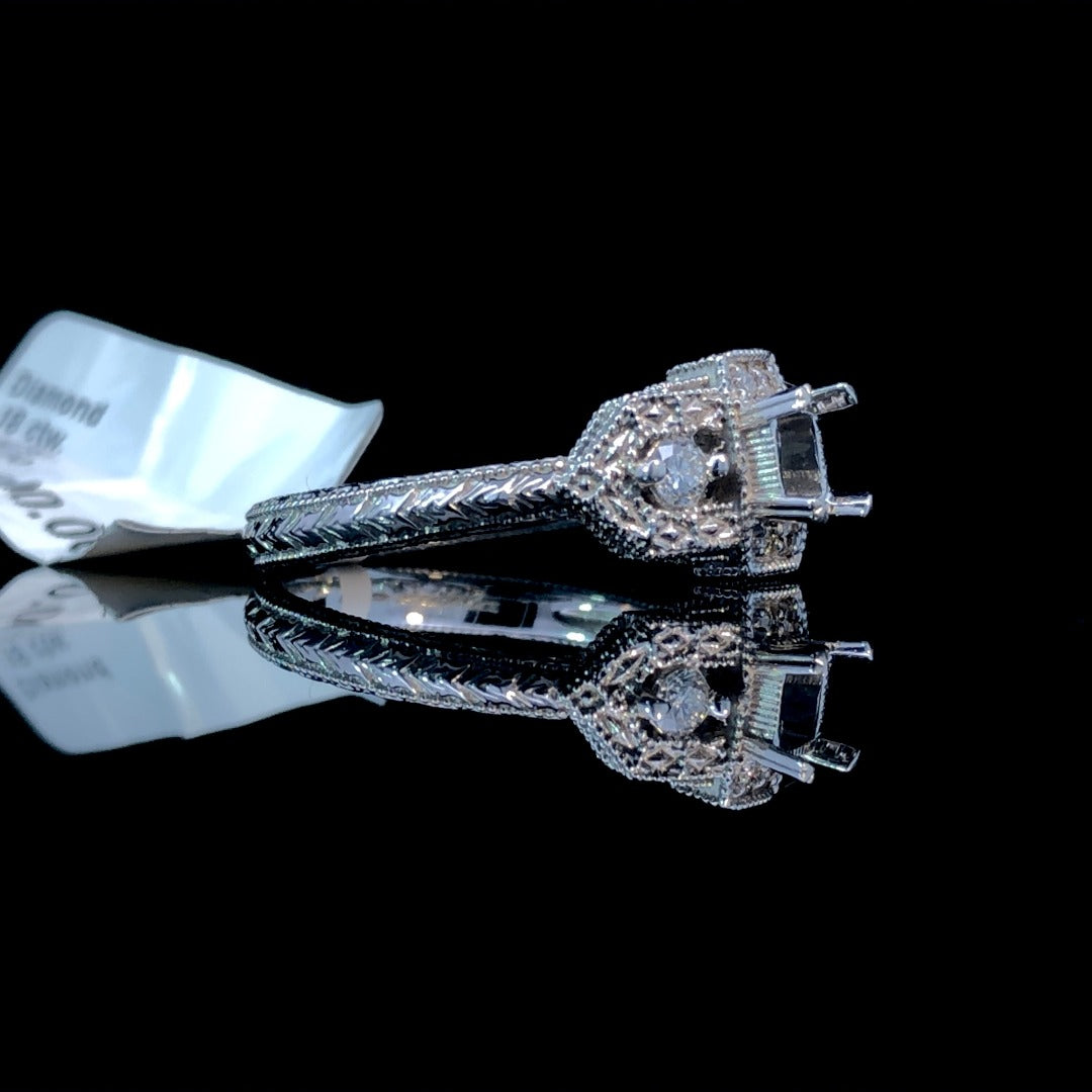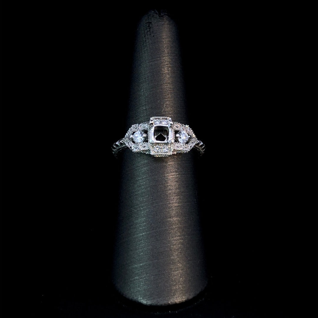 Indulge in timeless elegance with our semi mount ring. Crafted in luxurious 14kt white gold, this stunning piece showcases a vintage-inspired design adorned with .18ctw of sparkling round diamond accents. Intricate filigree and milgrain detailing add a touch of sophistication. Personalize it with the perfect center stone from our wide selection. Price is for the semi mount only. Center stone will be added at an additional cost. This ring is a size 7. If that size is not a perfect fit, first time sizing is free at the time of purchase. Additional sizing fees may apply.