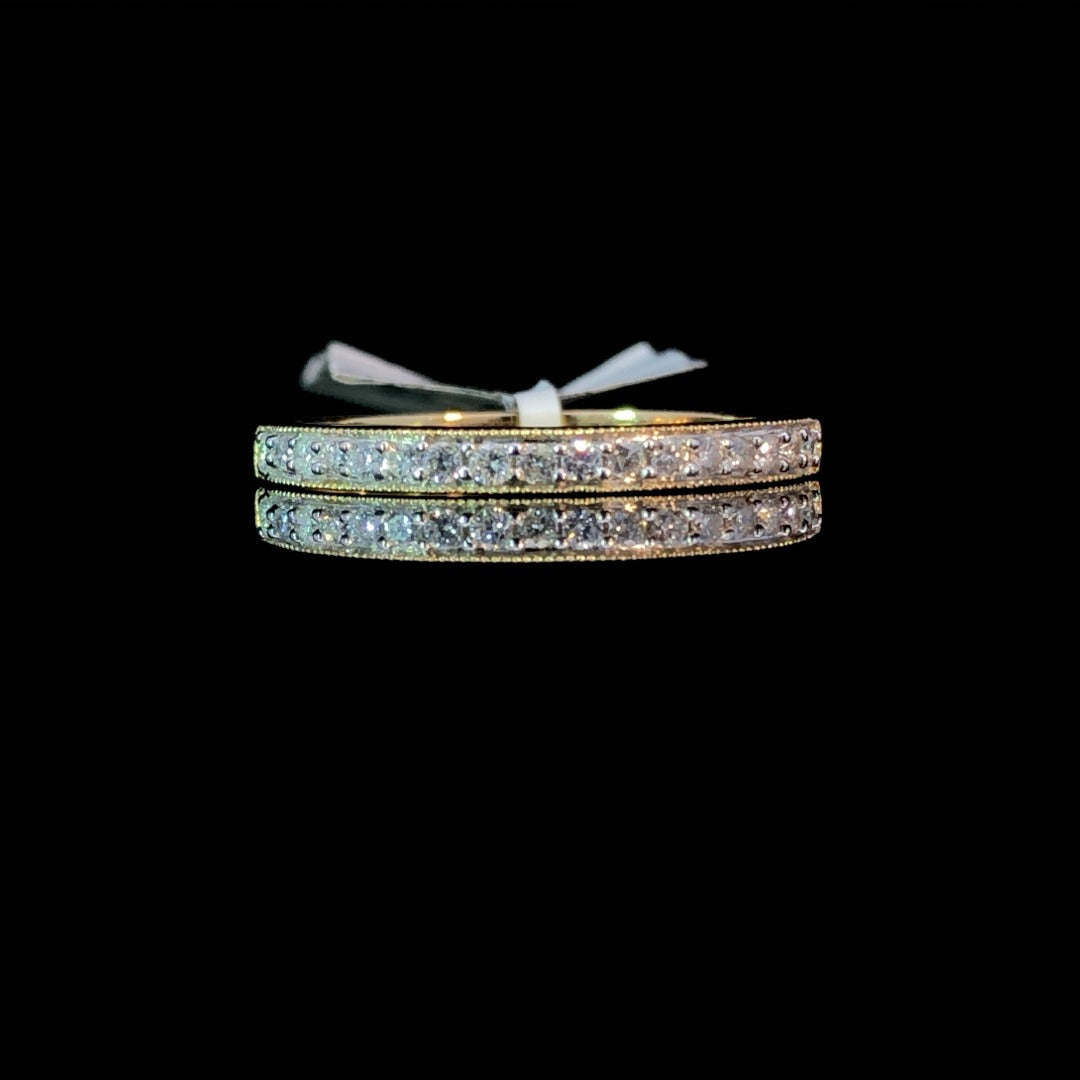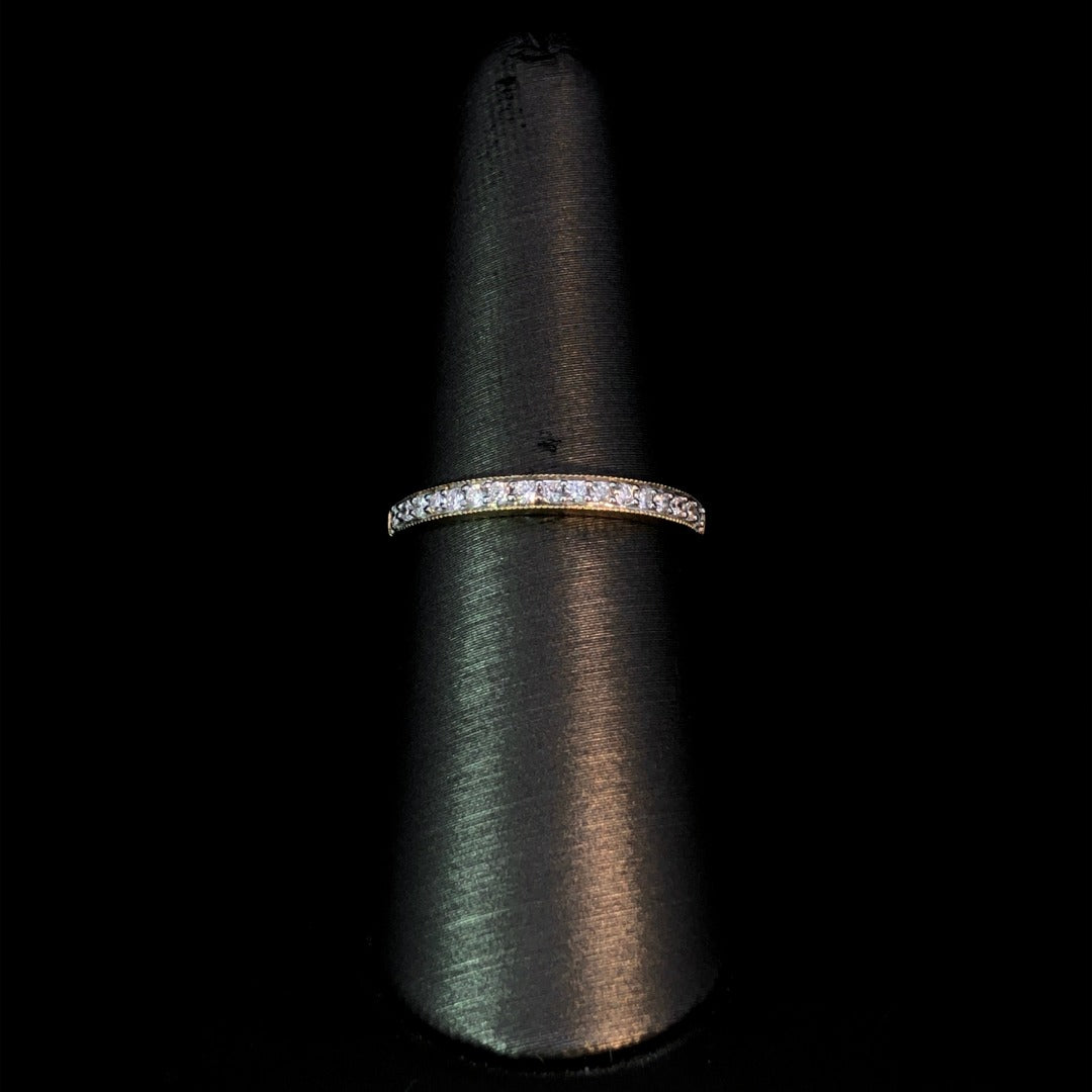Indulge in luxury with our 14kt yellow gold diamond band, featuring delicate milgrain detailing and .20ctw of brilliant round diamonds. This exquisite piece adds a touch of sophistication to any ensemble, making it the perfect accessory for any occasion. This ring is a size 7. If that size is not a perfect fit, first time sizing is free at the time of purchase. Additional sizing fees may apply.