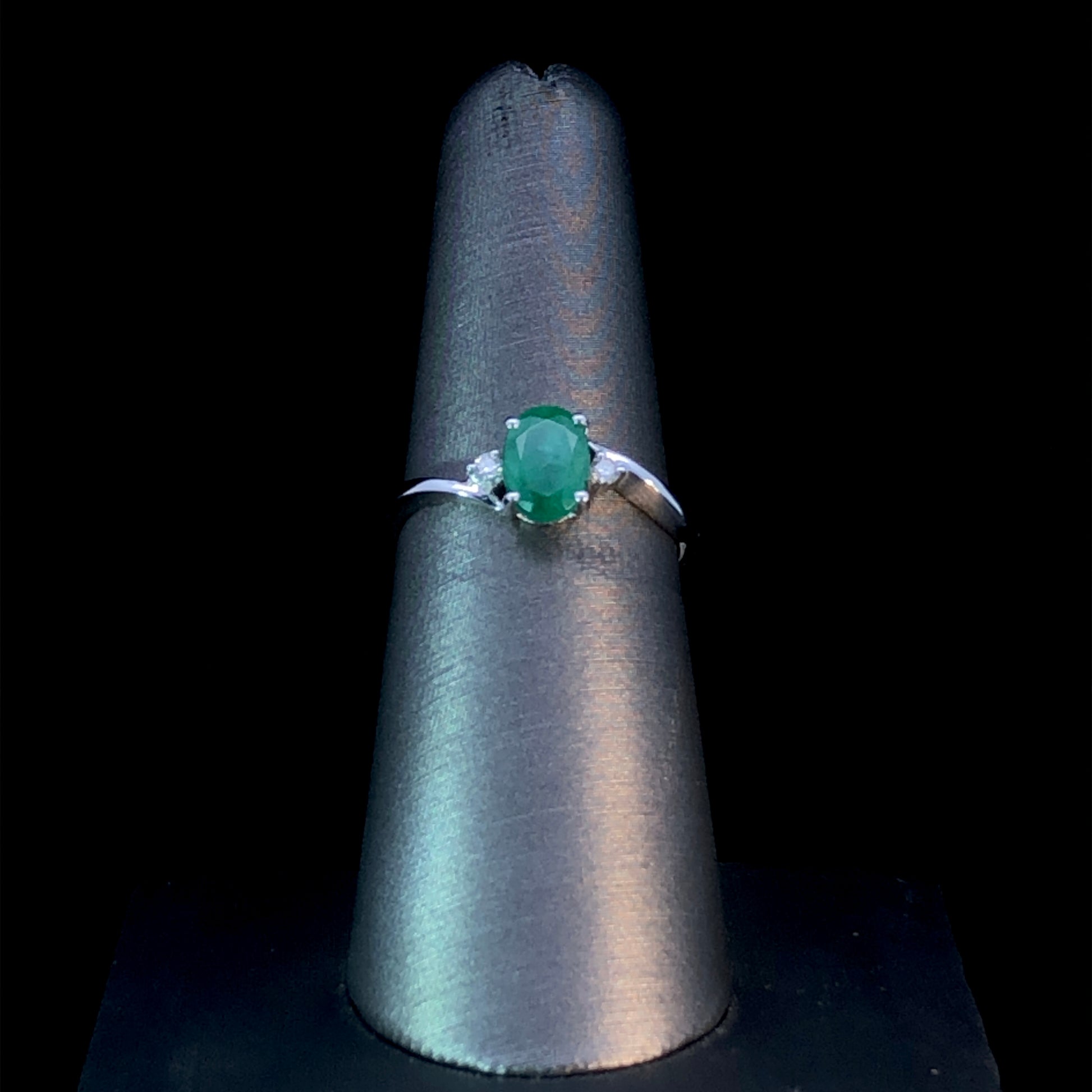 This exquisite 10kt white gold ring features a magnificent 1ct oval emerald and two round diamonds of .05ctw for an eye-catching sparkle. The classic combination of white gold, emerald and diamonds creates a timeless piece of jewelry you will treasure forever. This ring is a size 7. If that size is not a perfect fit, first time sizing is free at the time of purchase. Additional sizing fees may apply.