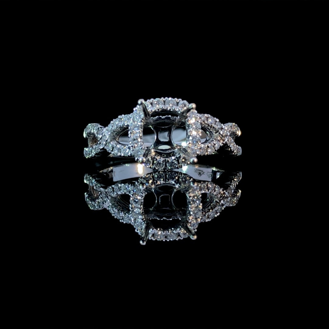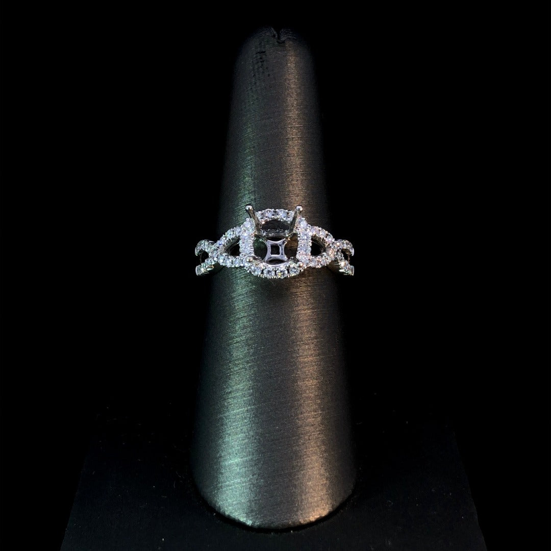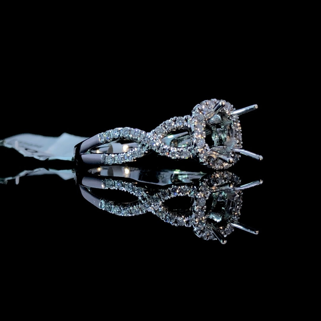 Enhance your style with our stunning 14kt white gold semi mount, featuring a .46ctw of sparkling round diamonds in a unique halo and twisted band design. Personalize it with your own center stone and make a statement that's uniquely you! Price is for the semi mount only. Center stone will be added at an additional cost. This ring is a size 7. If that size is not a perfect fit, first time sizing is free at the time of purchase. Additional sizing fees may apply.