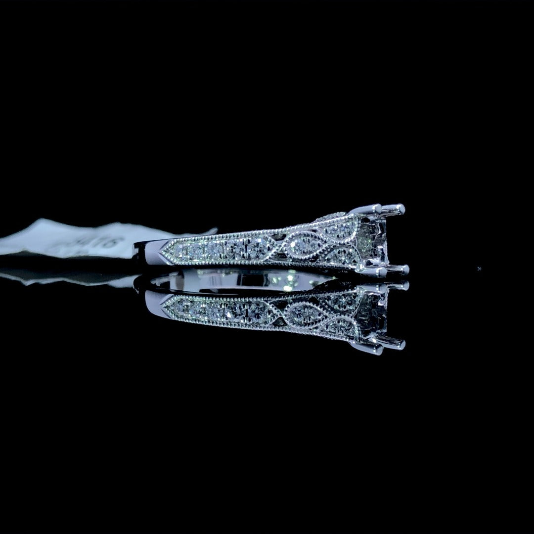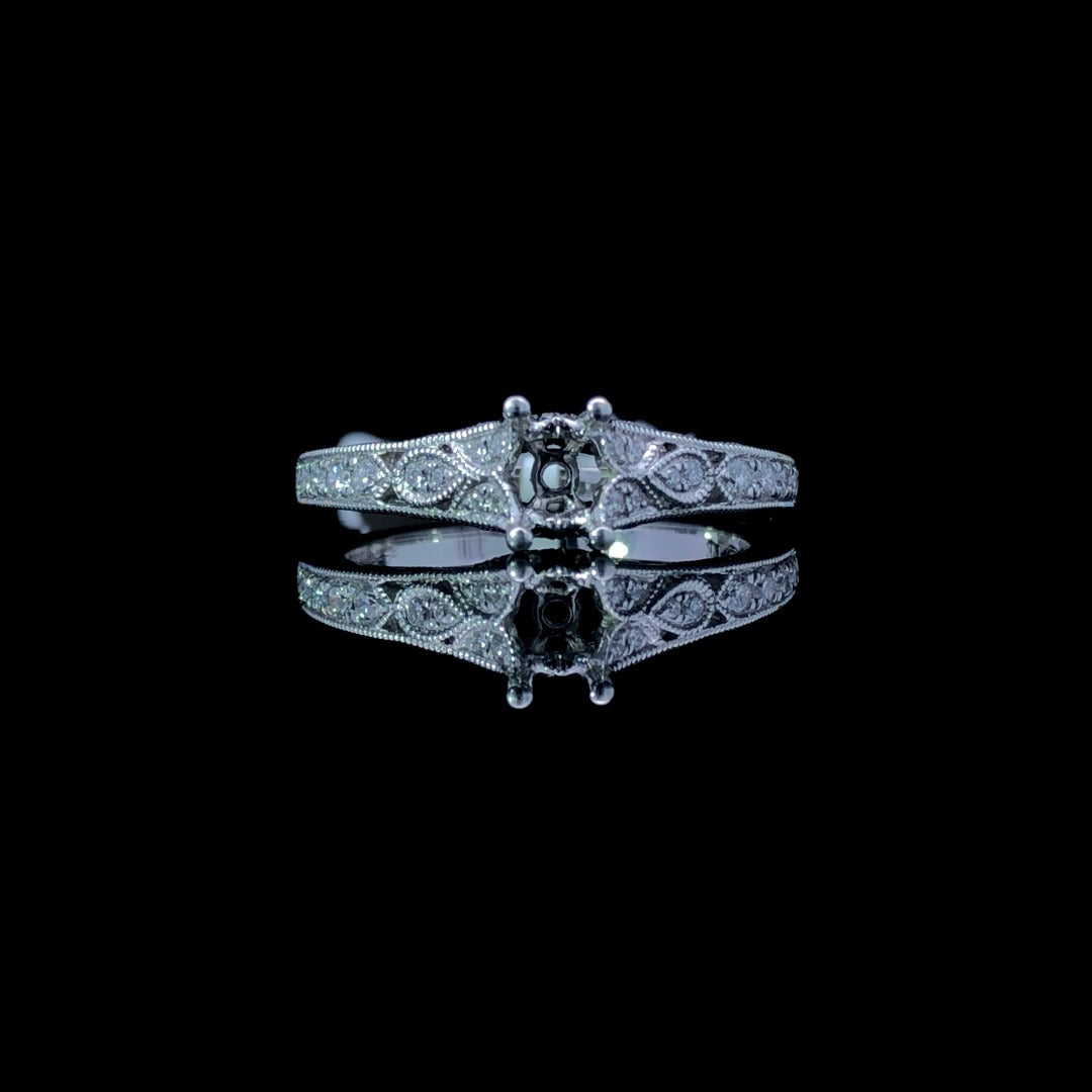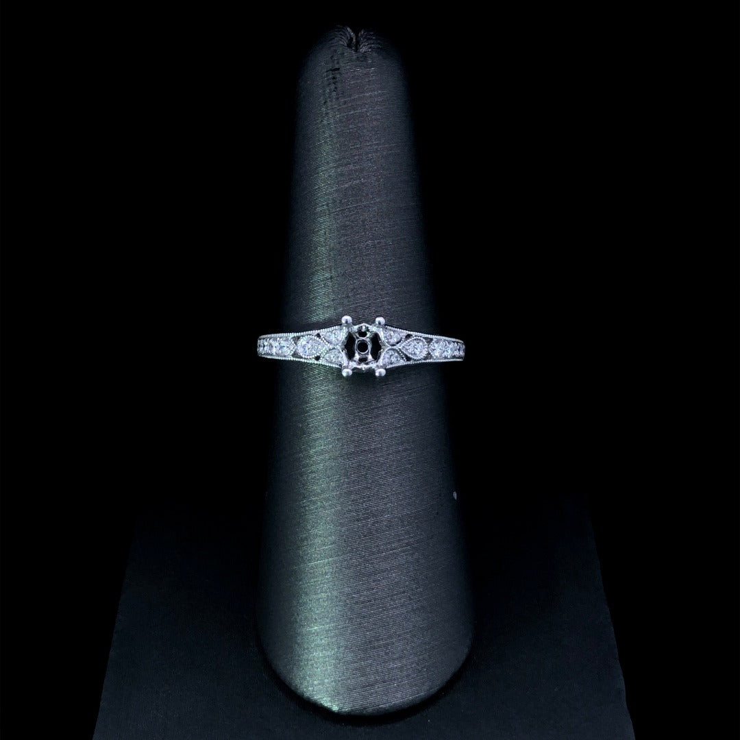 Transform your dream ring into a reality with this gorgeous diamond semi mount! Crafted from stunning 14kt white gold, this intricate filigree design is adorned with .23ctw of sparkling round diamonds. A truly elegant and timeless piece that will complete any look. Make a statement with this gorgeous diamond semi mount. Price is for the semi mount only. Center stone will be added at an additional cost. This ring is a size 7. If that size is not a perfect fit, first time sizing is free at the time of purchase. Additional sizing is free at the time of purchase. Additional sizing fees may apply.
