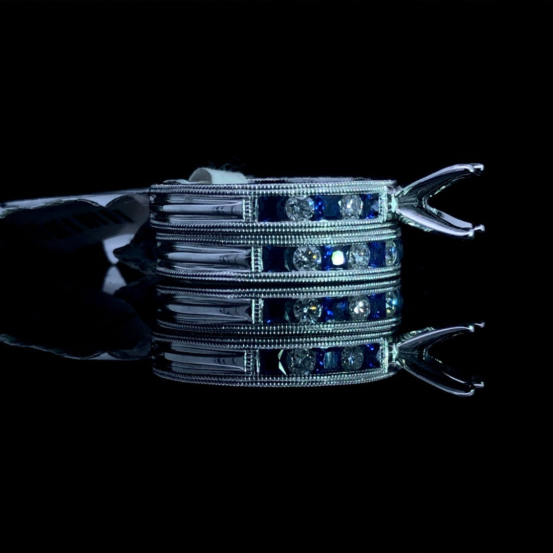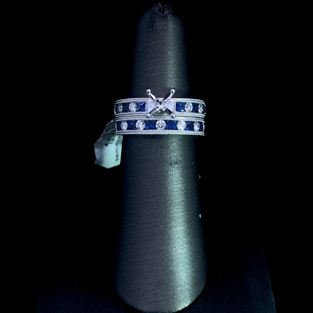 Add a touch of color to your jewelry collection with our stunning 14kt white gold semi mount. Featuring .76ctw alternating round diamonds and square sapphires, it's the perfect setting for your choice of center stone. Complete the look with our matching .92ctw band (sold separately). Experience luxury today! Price is for the semi mount only. Center stone and band will be added separately. This ring is a size 6.75. If that size is not a perfect fit, first time sizing is free at the time of purchase. Additional sizing fees may apply.