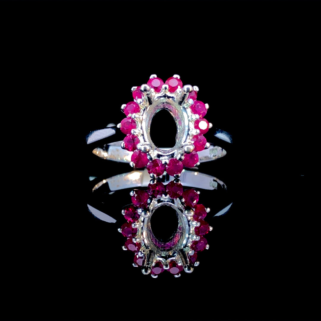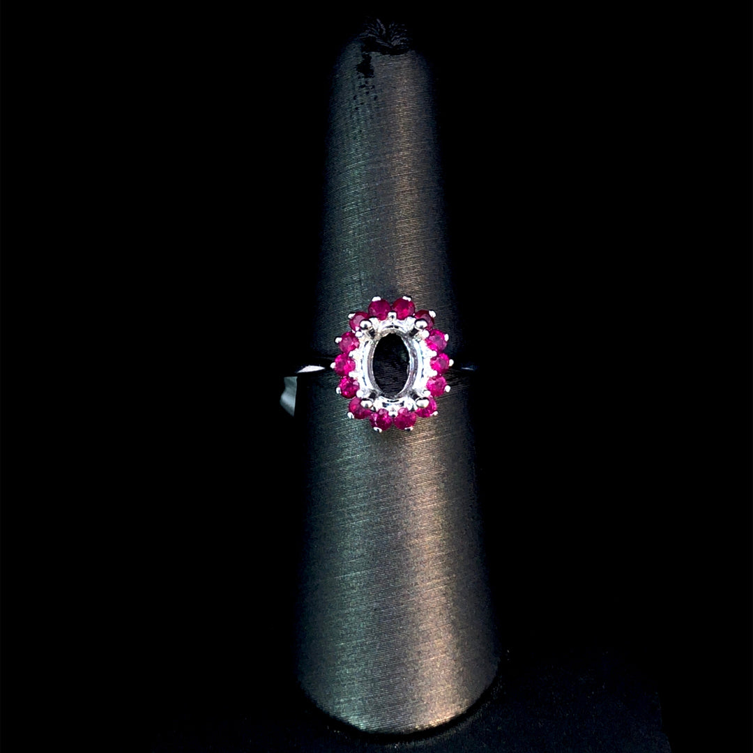 This elegant semi-mount ring showcases a radiant oval halo adorned with .69 carats of vibrant rubies, set on a sleek 14kt white gold band. Personalize your jewelry by selecting a center stone from our wide collection of loose stones, creating a truly unique and colorful piece that suits your style perfectly. Price is for the semi mount only. Center stone will be added at an additional cost. This ring is a size 7. If that size is not a perfect fit, first time sizing is free at the time of purchase. Additional sizing fees may apply.