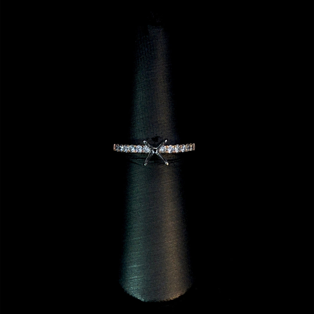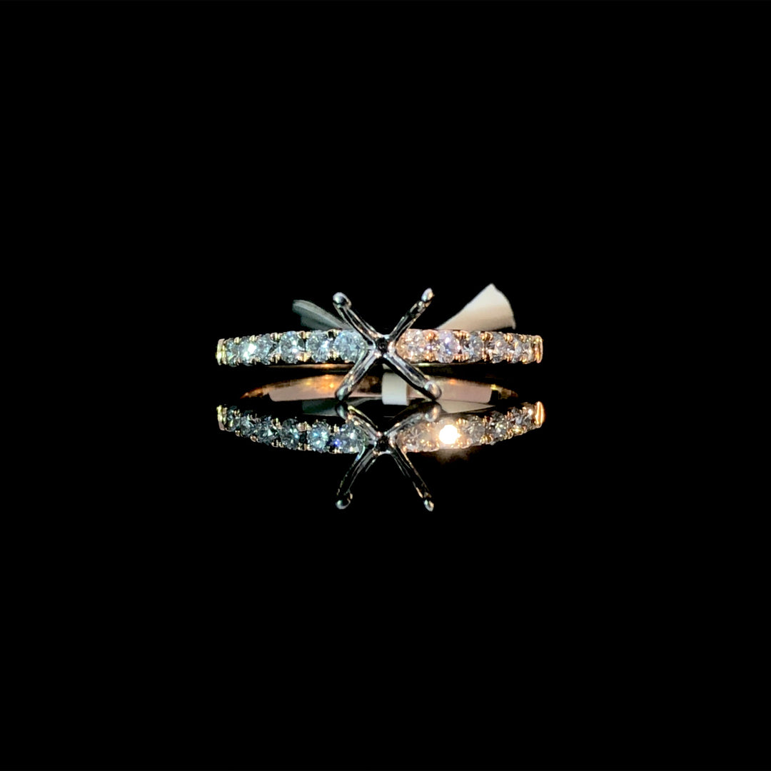 This timeless 14kt rose gold semi mount showcases a refined design with .33ctw of round diamonds gracefully adorning the band. Crafted to perfectly complement your chosen center stone from our exclusive collection, this piece elevates elegance and personalization in one exquisite setting. Price is for the semi mount only. Center stone will be added at an additional cost. This ring is a size 6. If that size is not a perfect fit, first time sizing is free at the time of purchase. Additional sizing fees may apply.