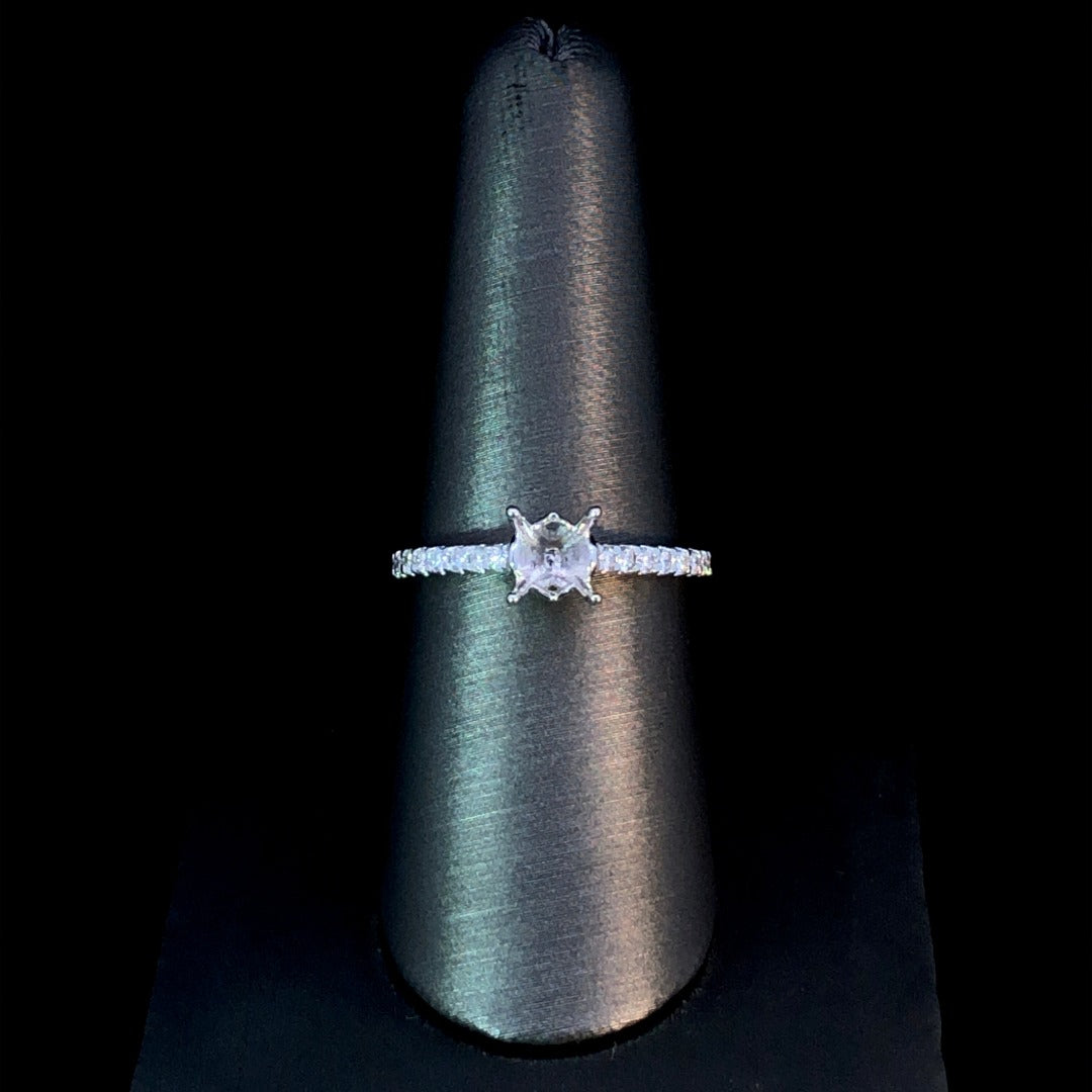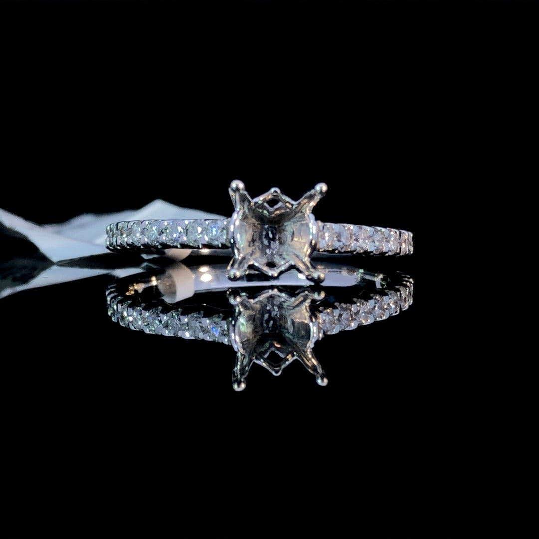 Capture her heart with this stunning, one-of-a-kind diamond semi mount. Expertly crafted with .39ctw of round diamonds set in 14kt white gold with yellow gold accents beneath, this gorgeous piece is the perfect way to express your love! Price is for the semi mount only. Center stone will be added at an additional cost. This ring is a size 7. If that size is not a perfect fit, first time sizing is free at the time of purchase. Additional sizing fees may apply.