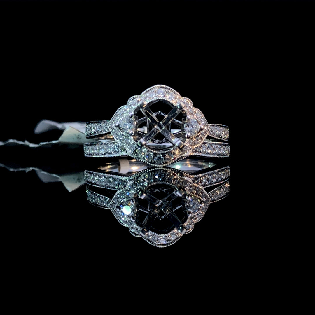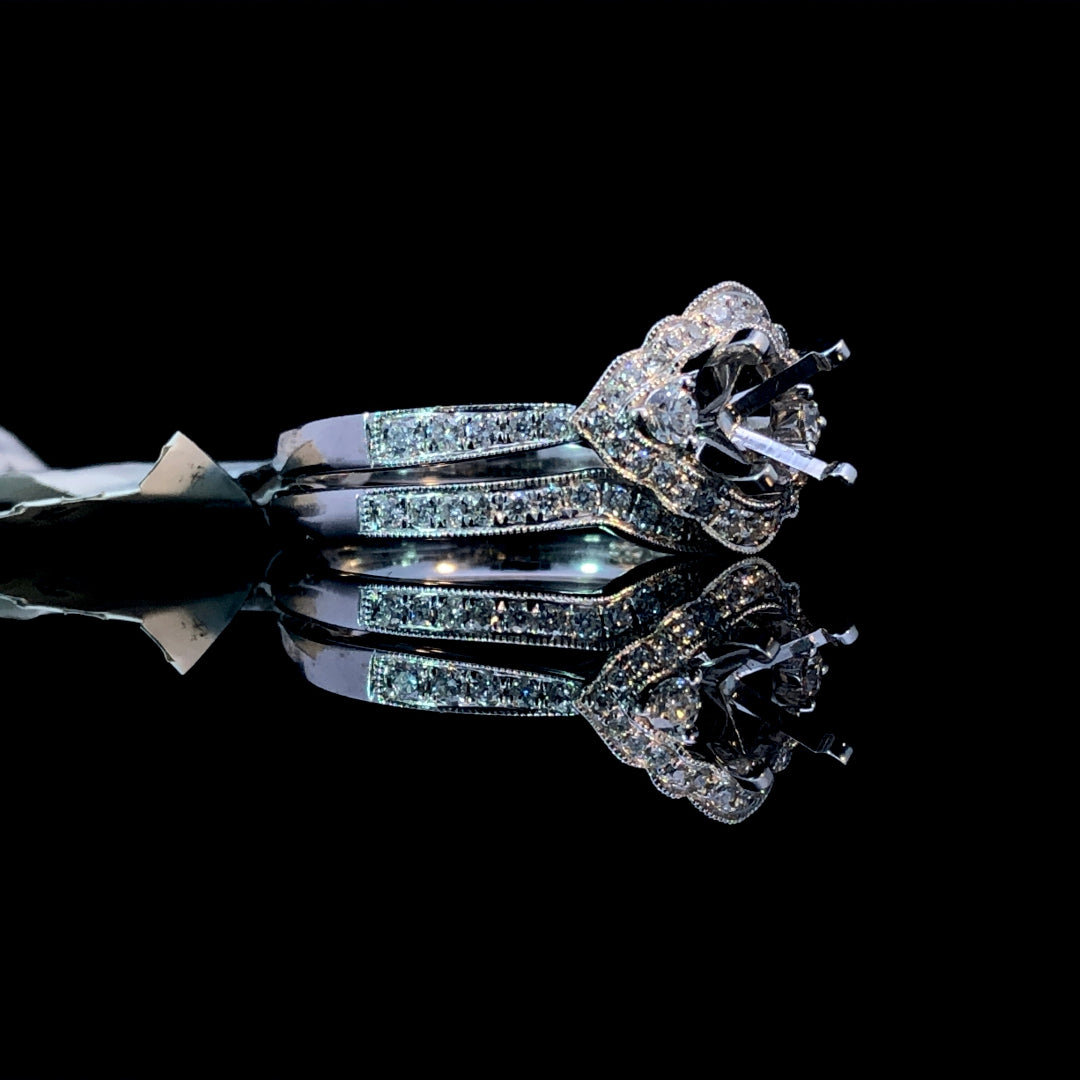 Crafted from 14kt white gold, this diamond semi-mount provides a beautiful base for your custom ring. Featuring a decorative halo, two round side diamonds, and cascading diamonds along the band, it sparkles with .30ctw of round diamonds. Milgrain details enhance its vintage-inspired charm. Choose your favorite center stone from our loose stone collection to complete this stunning, personalized piece. Add the matching diamond band (sold separately) to create a stunning bridal set. Price is for the semi mount only. Center stone and band will be added at an additional cost. This ring is a size 6.5. If that size is not a perfect fit, first time sizing is free at the time of purchase.