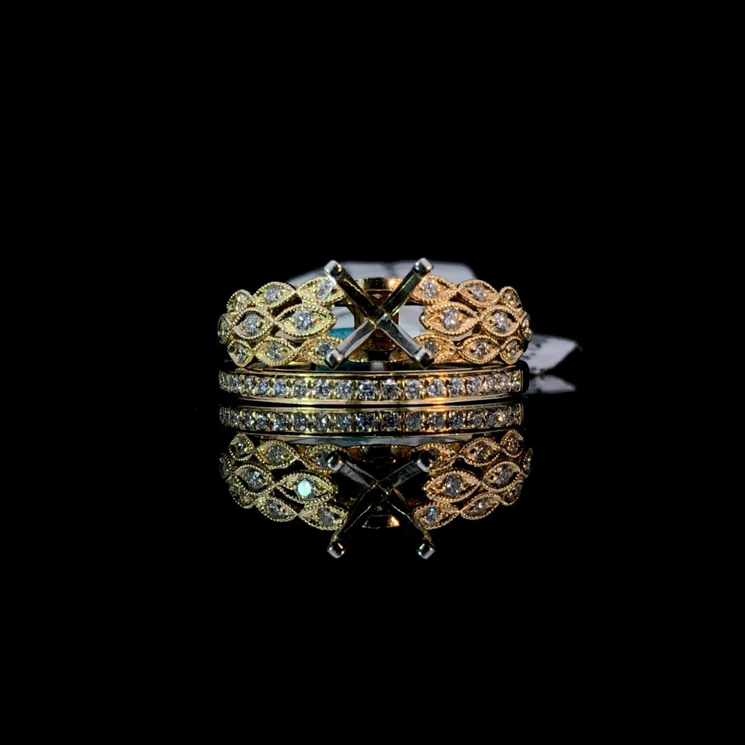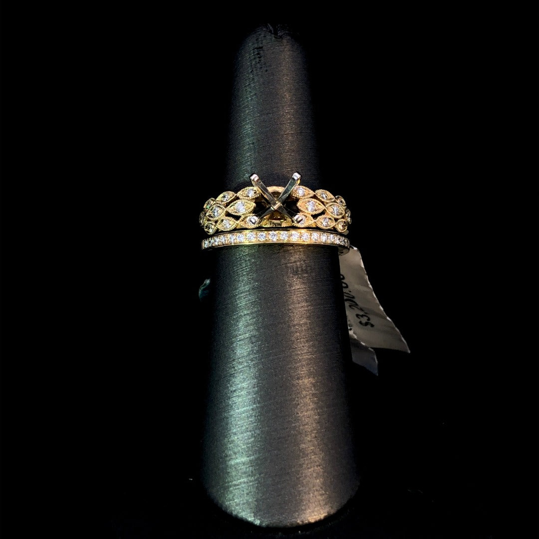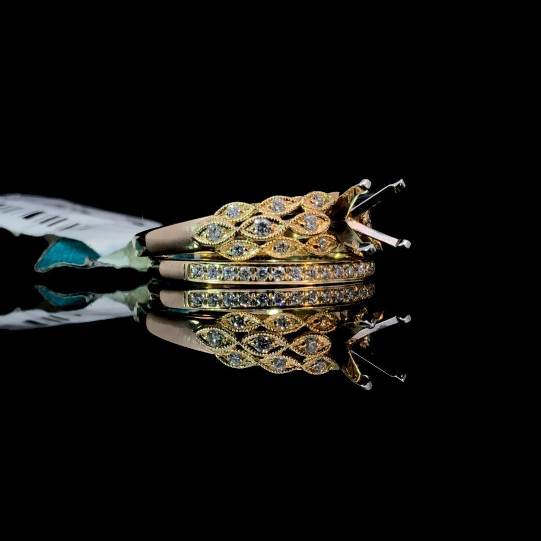 Indulge in luxury with our stunning diamond semi mount. This 14kt yellow gold ring features a captivating design with .30ctw of round diamonds set in elegant milgrain detailed marquise shapes. Complete your engagement ring with a center stone of your choosing and add our matching .13ctw diamond band (sold separately) for the ultimate symbol of love. Price is for the semi mount only. Center stone and band will be added at an additional cost. This ring is a size 6.5. If that size is not a perfect fit, first time sizing is free at the time of purchase. Additional sizing fees may apply.
