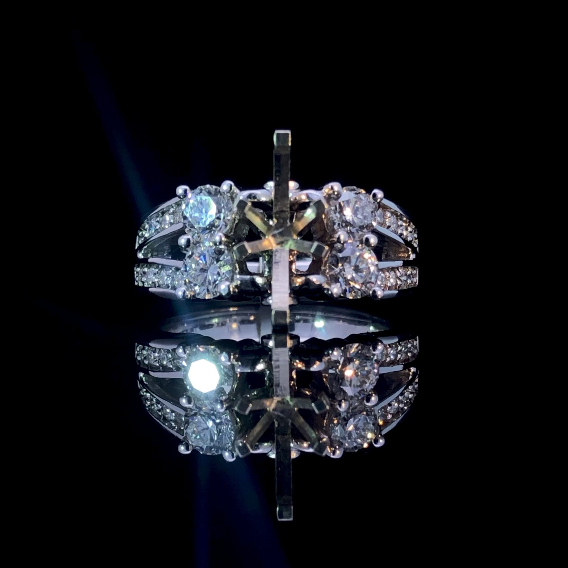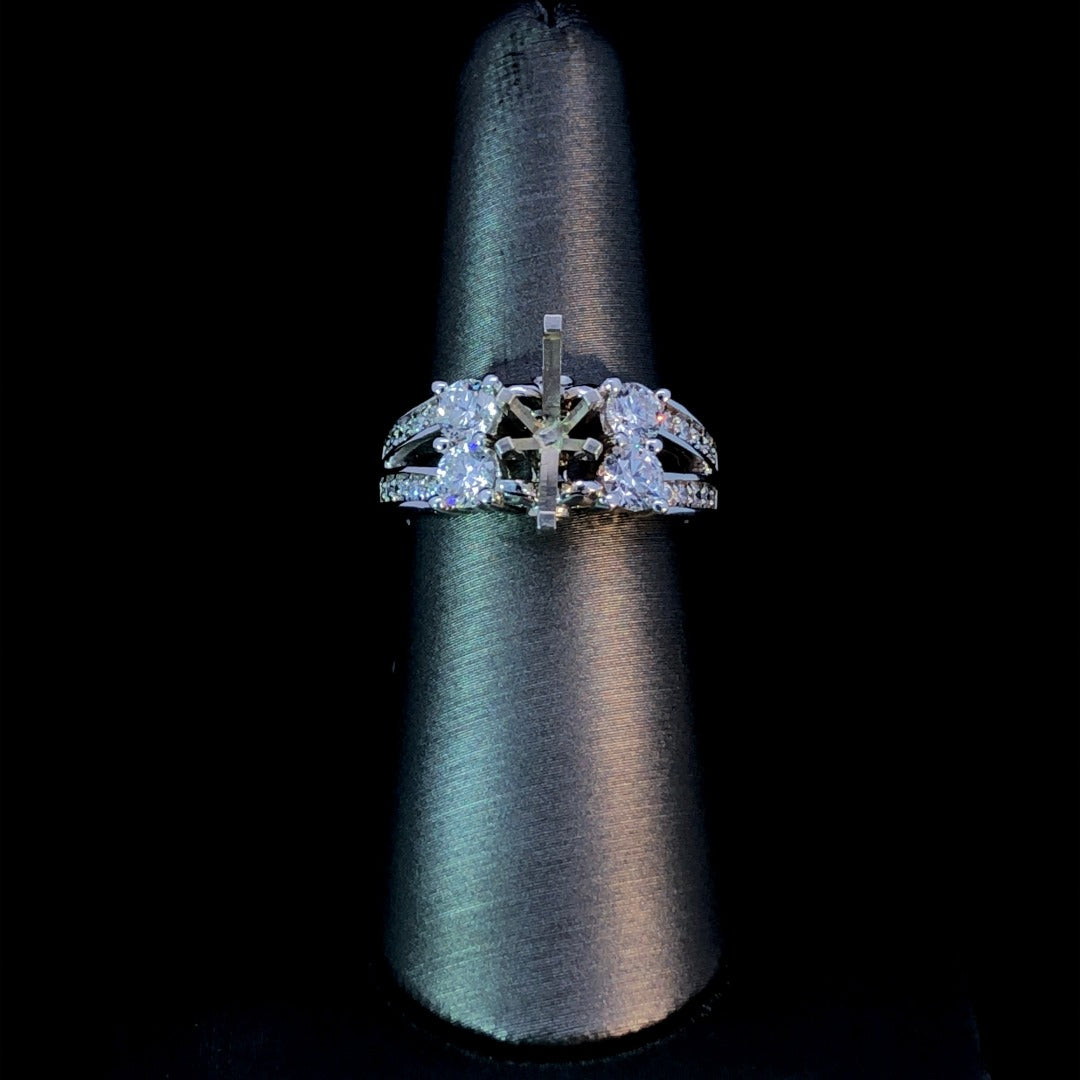 A timeless classic, this 14kt white gold diamond semi mount is adorned with 1.51ctw of dazzling round diamonds. With two larger stones at each side of the center stone, it creates an eye-catching sparkle that will last forever! Feel like royalty with this stunning ring! Price is for the semi mount only. Center stone will be added at an additional cost. This ring is a size 7. If that size is not a perfect fit, first time sizing is free at the time of purchase. Additional sizing fees may apply.