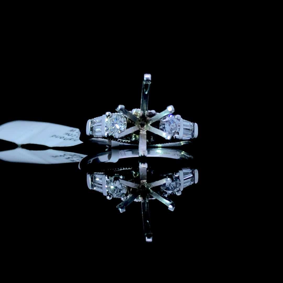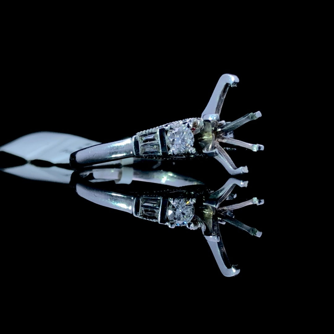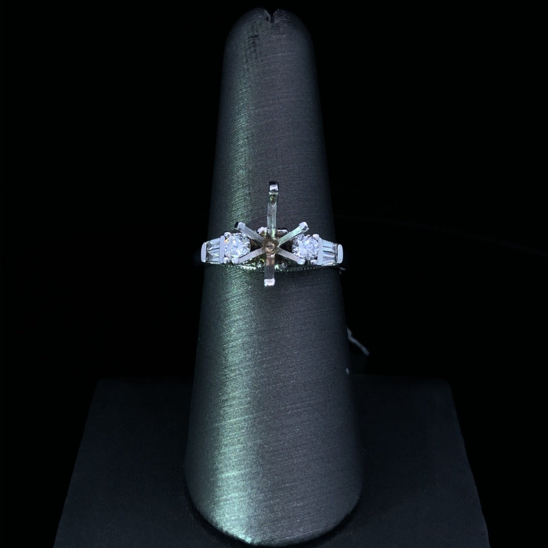 Create your dream ring with this versatile semi mount. Featuring .52ctw of round and baguette diamonds set in 14kt white gold, it's designed to hold the perfect center stone of your choice for a timeless and elegant look. The possibilities are endless! Price is for the semi mount only. Center stone will be added at an additional cost. This ring is a size 7. If that size is not a perfect fit, first time sizing is free at the time of purchase. Additional sizing fees may apply.