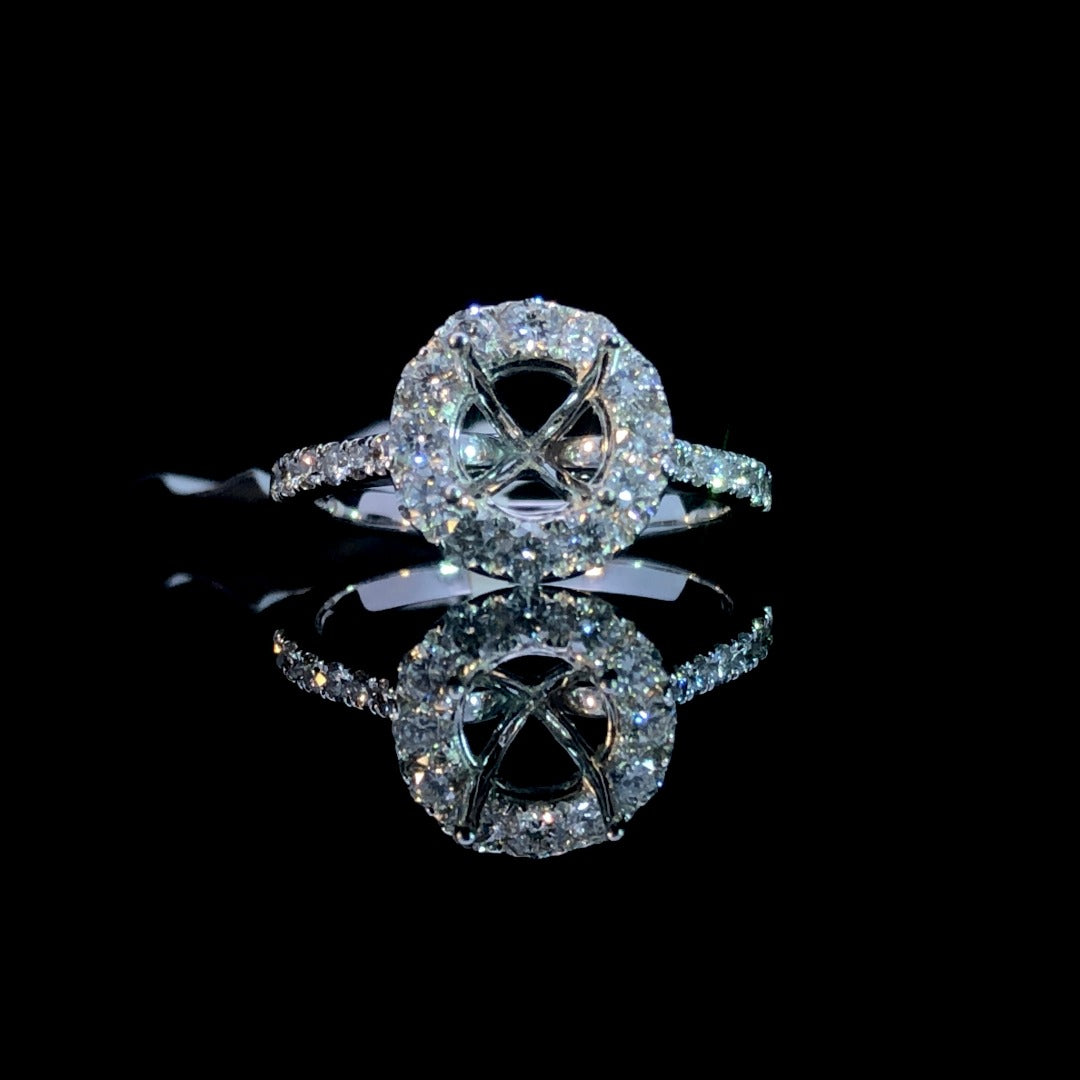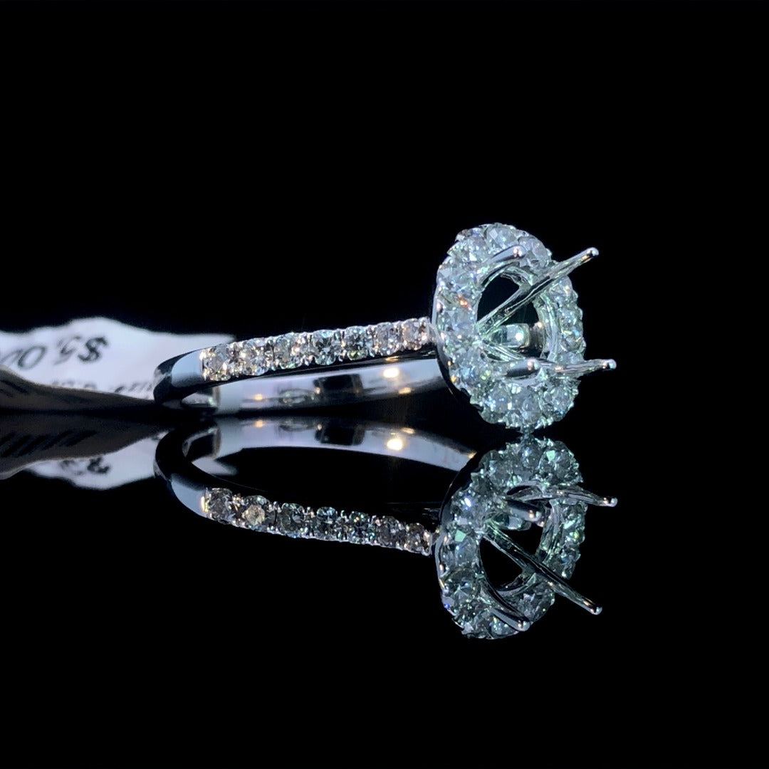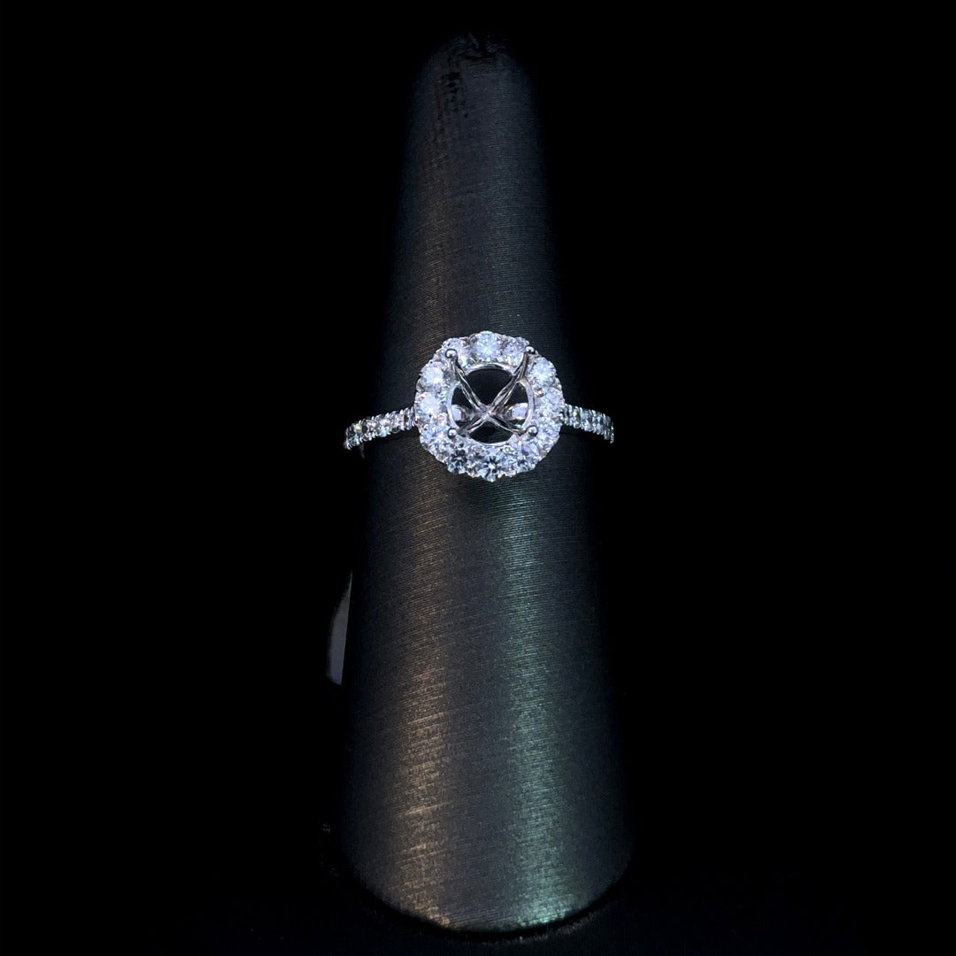Indulge in timeless elegance with this beautiful semi mount ring. Crafted in 14kt white gold, it boasts a round diamond halo and cascading diamonds on the band, totaling .80ctw. Personalize it by choosing the perfect round center stone from our exclusive collection. A classic choice with a touch of glamour! Price is for the semi mount only. Center stone will be added at an additional cost. This ring is a size 6. If that size is not a perfect fit, first time sizing is free at the time of purchase. Additional sizing fees may apply.
