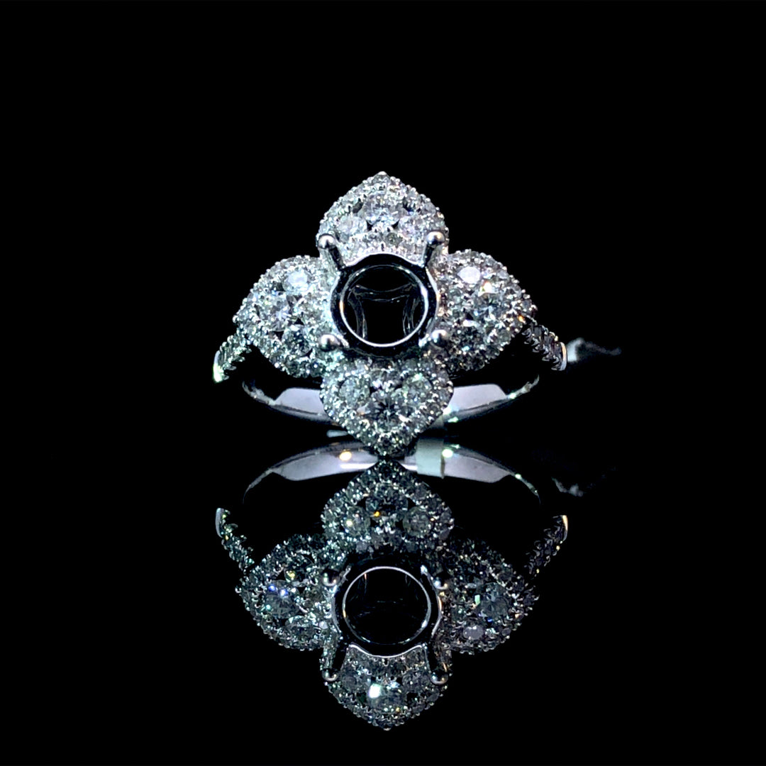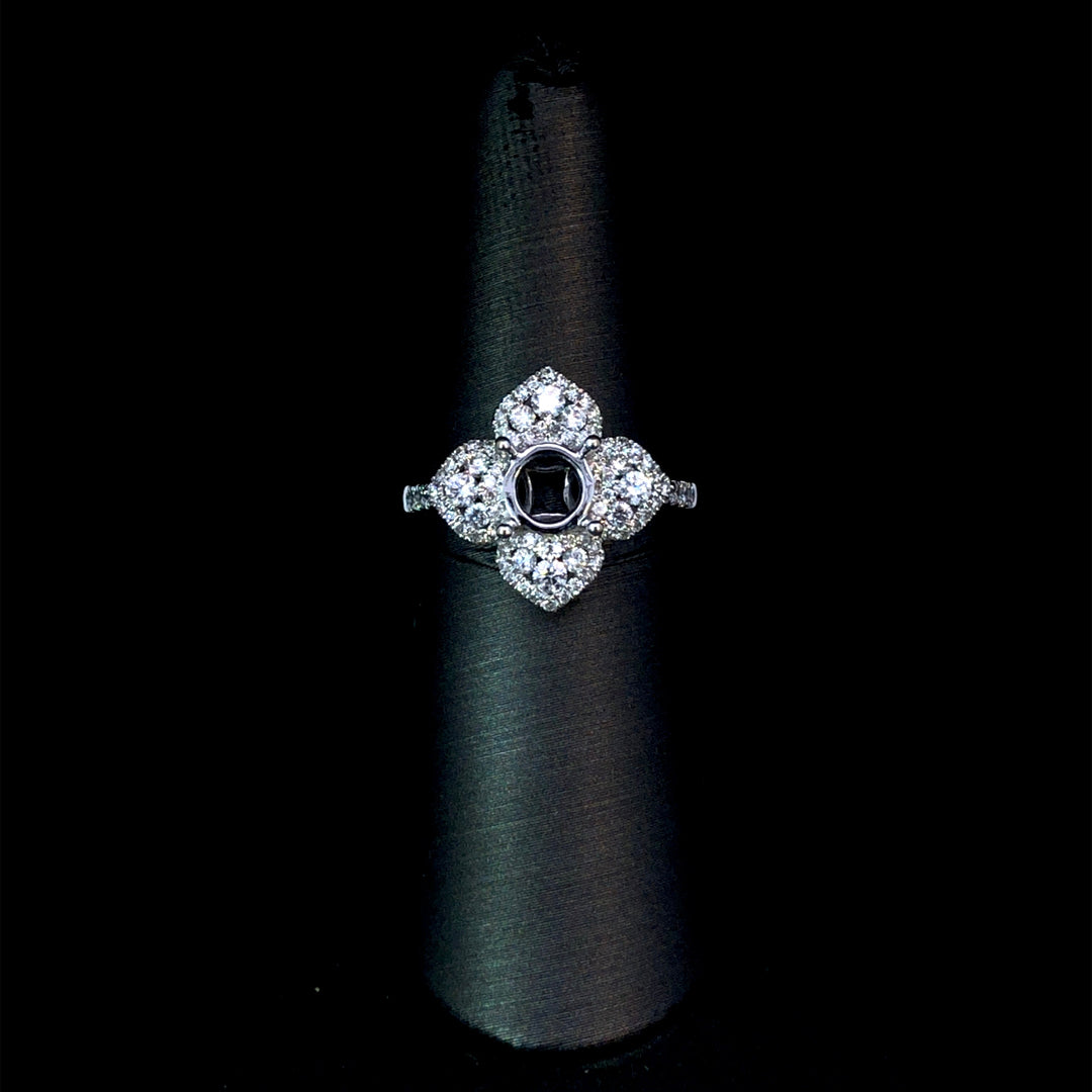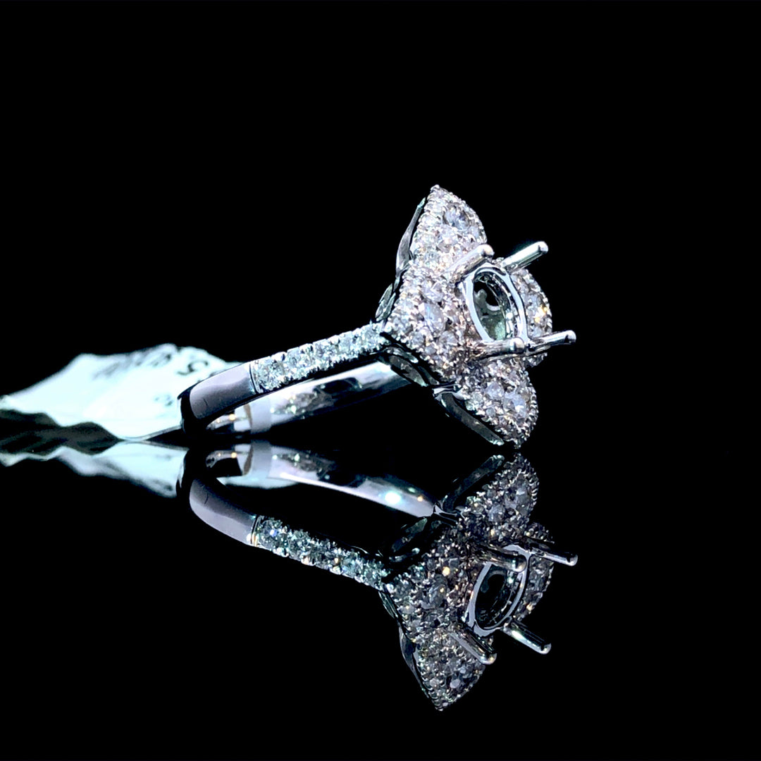 Craft your perfect engagement ring with this exquisite diamond semi mount. Featuring a decorative halo design and diamond-accented band, this 14kt white gold setting showcases .80ctw of brilliant round diamonds that catch light from every angle. The versatile design welcomes your choice of center stone, allowing you to create a truly personalized piece that reflects your unique style and vision. Let us help you bring your dream ring to life. Price is for the semi mount only. Center stone will be added at an additional cost. This ring is a size 6.5. If that size is not a perfect fit, first time sizing is free at the time of purchase. Additional sizing fees may apply.
