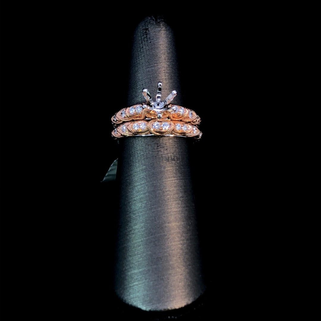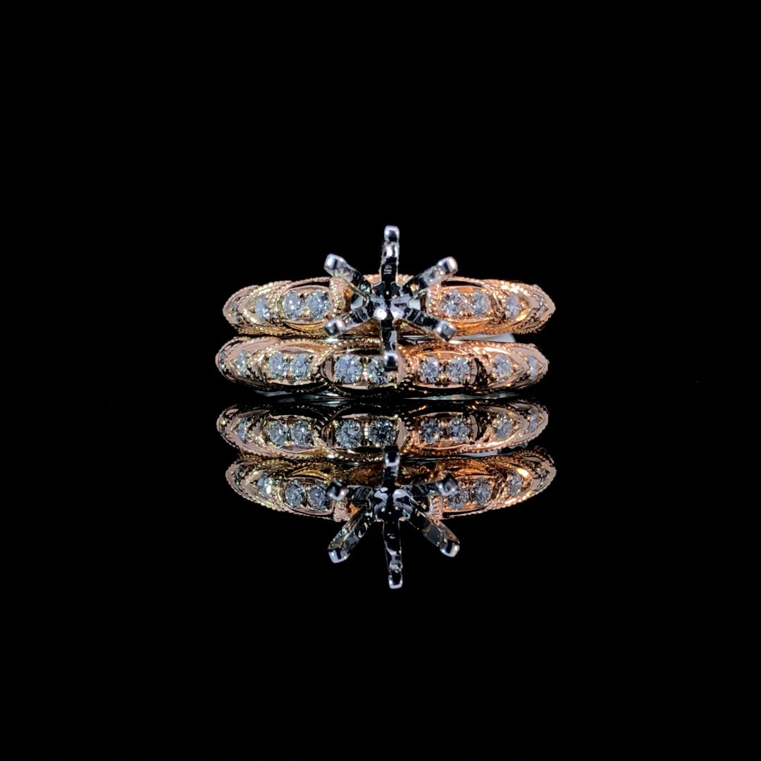 Indulge in luxury with this stunning 14kt 2-tone gold diamond semi mount. The intricate rose gold design, accentuated with scalloped milgrain details and .17ctw of round diamonds, sits atop a white gold shank. Choose your own center stone from our unmatched selection and complete this masterpiece. Add the matching diamond band (sold separately) for a complete bridal set. Price is for the semi mount only. Center stone will be added at an additional cost. This ring is a size 6. If that size is not a perfect fit, first time sizing is free at the time of purchase. Additional sizing fees may apply.