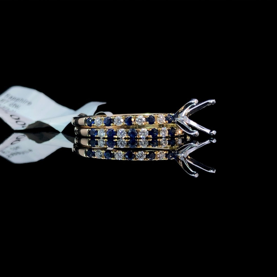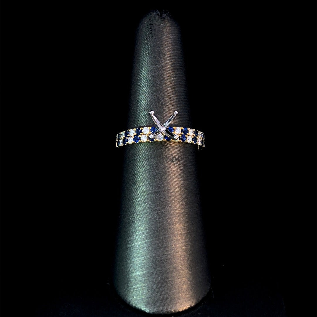 Elevate your jewelry collection with this gorgeous set. Crafted in 14kt yellow gold, this semi and band set boasts .67ctw of round sapphires and diamonds set in an alternating pattern. Personalize it with a center stone of your choice from our exquisite loose stone selection. Price is for the semi and band only. Center stone will be added at an additional cost. This ring is a size 6.5. If that size is not a perfect fit, first time sizing is free at the time of purchase. Additional sizing fees may apply.