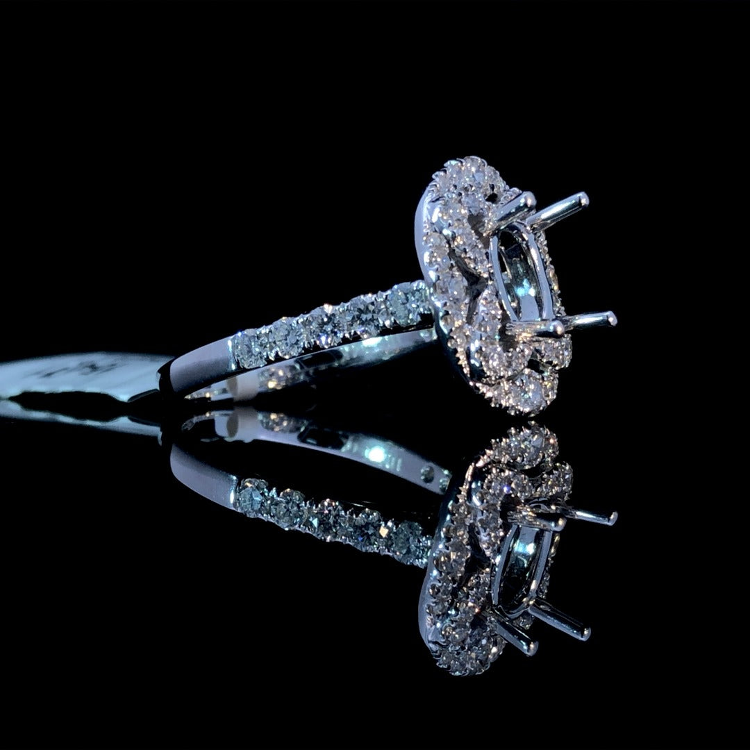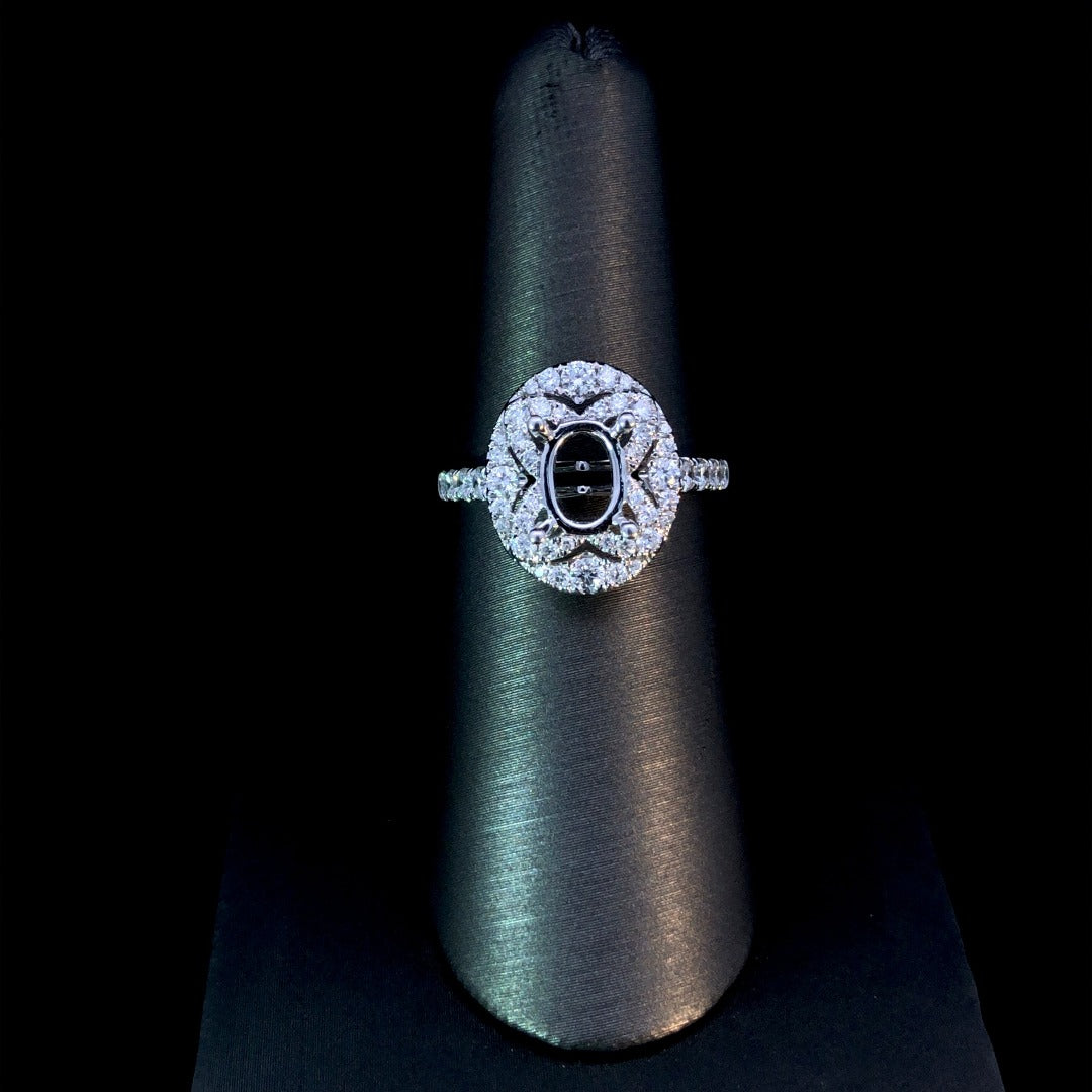 The perfect symbol of your everlasting love. This stunning diamond semi mount features a beautiful oval shaped halo and intricate design, with sparkling round diamonds encrusting the band. Crafted in 14kt white gold, it boasts a total diamond weight of .89ctw. Complete your dream ring by choosing your own center stone from our vast selection of loose stones. Price is for the semi mount only. Center stone will be added at an additional cost. This ring is a size 6.5. If that size is not a perfect fit, first time sizing is free at the time of purchase. Additional sizing fees may apply.