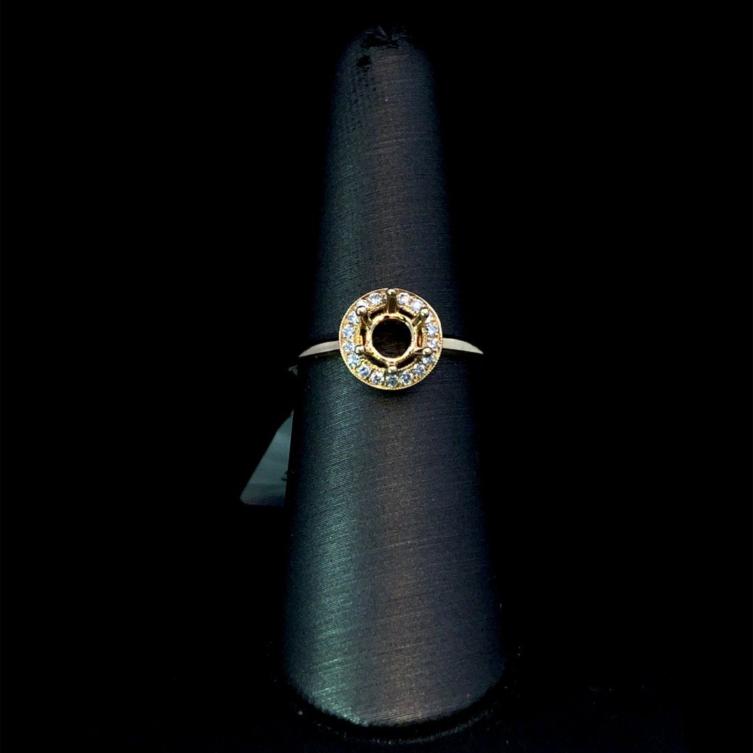 Create a stunning engagement ring with this diamond semi mount. Designed in 14kt yellow gold, this simple and elegant setting features a halo of sparkling round diamonds totaling .16ctw and delicate milgrain details. Choose from our collection of loose stones to complete your perfect ring! Price is for the semi mount only. Center stone will be added at an additional cost. This ring is a size 6.75. If that size is not a perfect fit, first time sizing is free at the time of purchase. Additional sizing fees may apply.