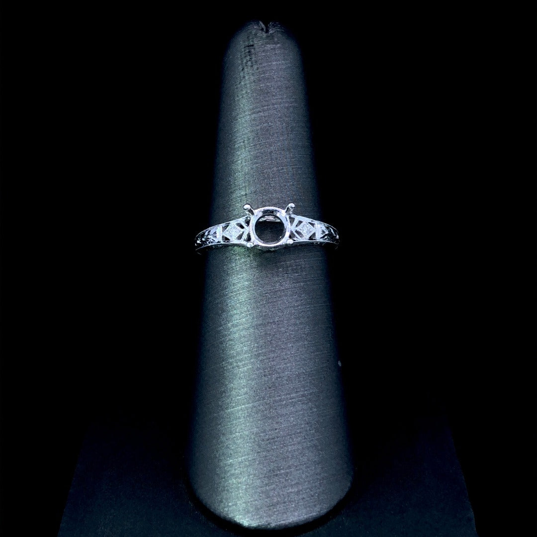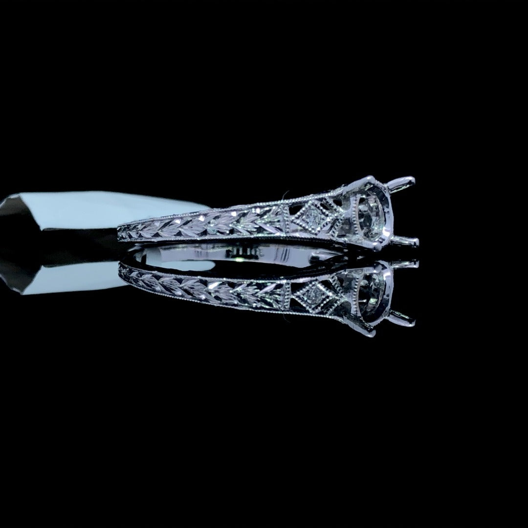 Choose your own center stone and create a stunning ring with our stunning semi mount! Made of 14kt white gold, this exquisite piece features a milgrain design with sparkling .03ctw round diamond accents. Personalize your ring and make a statement with this beautiful semi mount. Price is for the semi mount only. Center stone will be added at an additional cost. This ring is a size 6. If that size is not a perfect fit, first time sizing is free at the time of purchase. Additional sizing fees may apply.