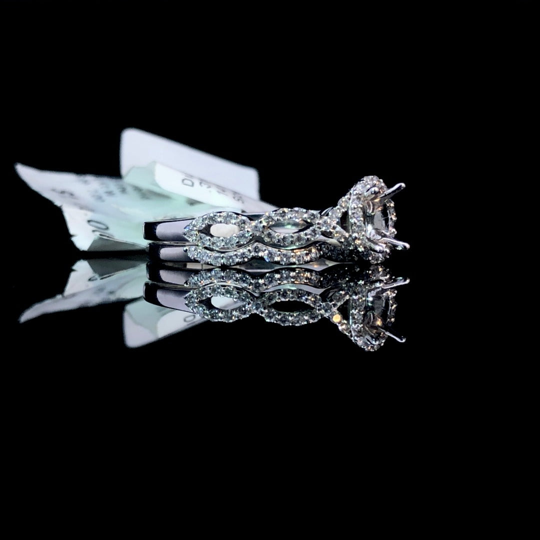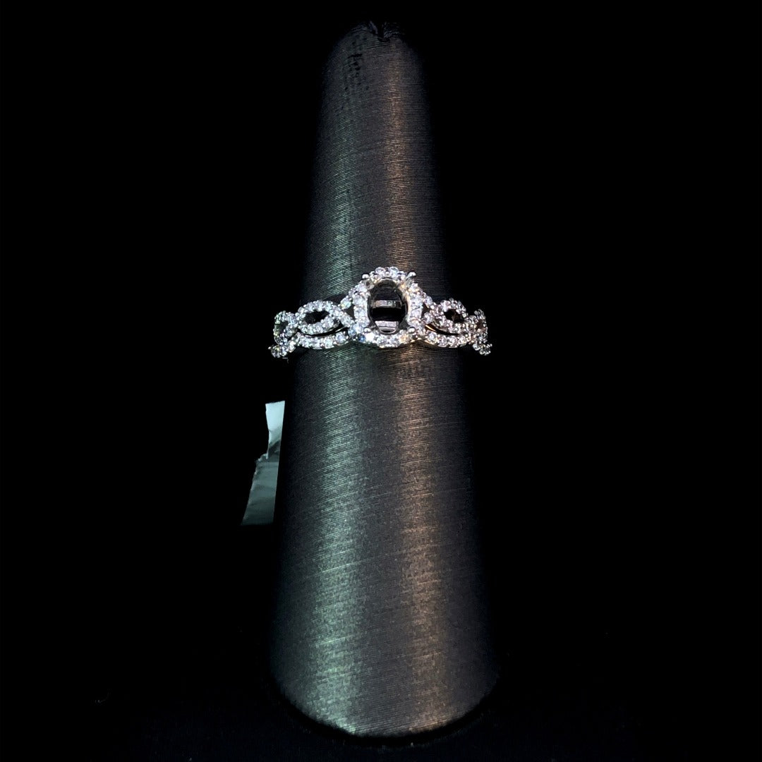 Elevate your look with our stunning 14kt white gold diamond semi mount. Featuring a timeless design with a modern twist, it boasts an oval diamond halo and sparkling diamonds lining the twisted band. Choose from our collection to complete this .31ctw diamond masterpiece. Don't forget the matching .13ctw diamond contour band (sold separately) for a perfect set. Price is for the semi mount only. Center stone and band will be added at an additional cost. This ring is a size 7. If that size is not a perfect fit, first time sizing is free at the time of purchase. Additional sizing fees may apply.