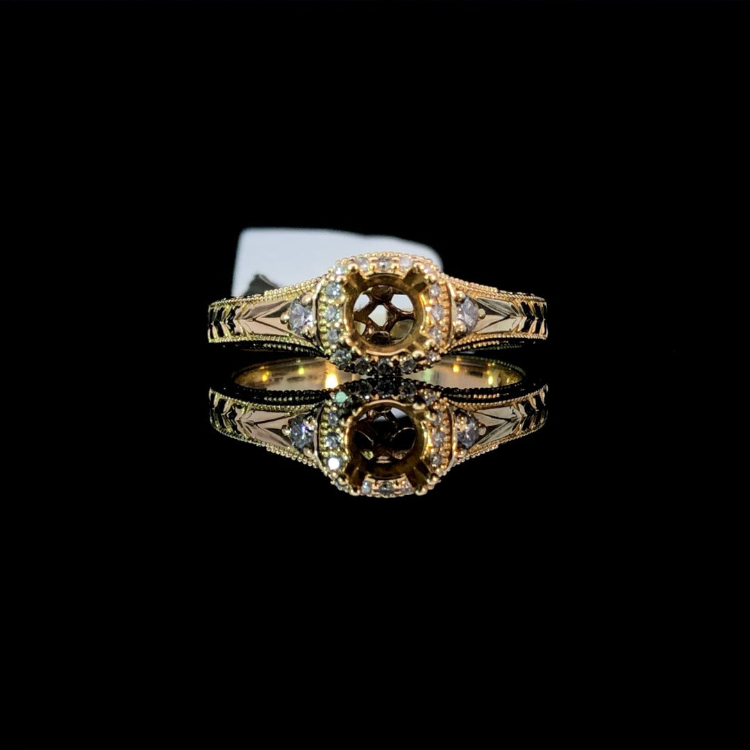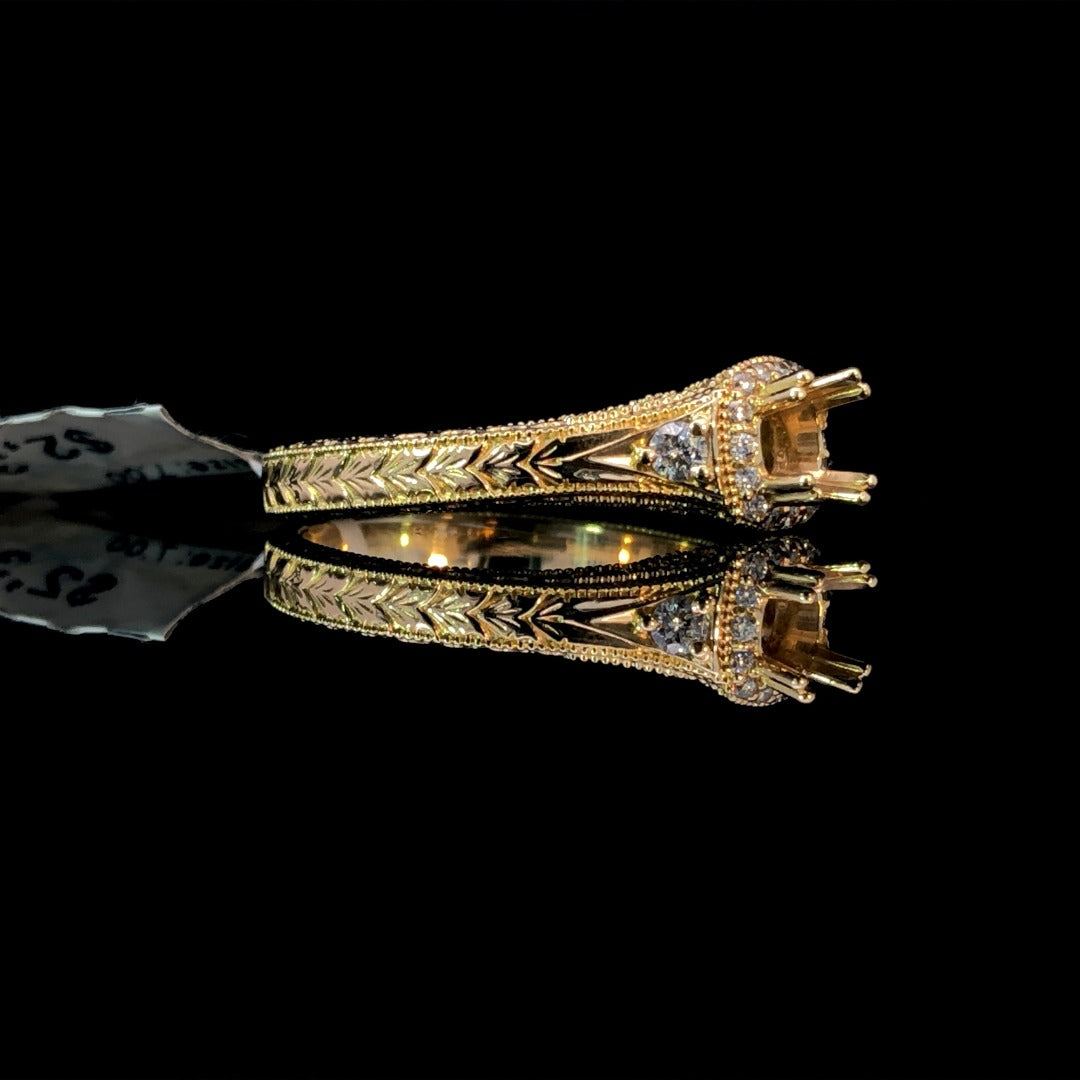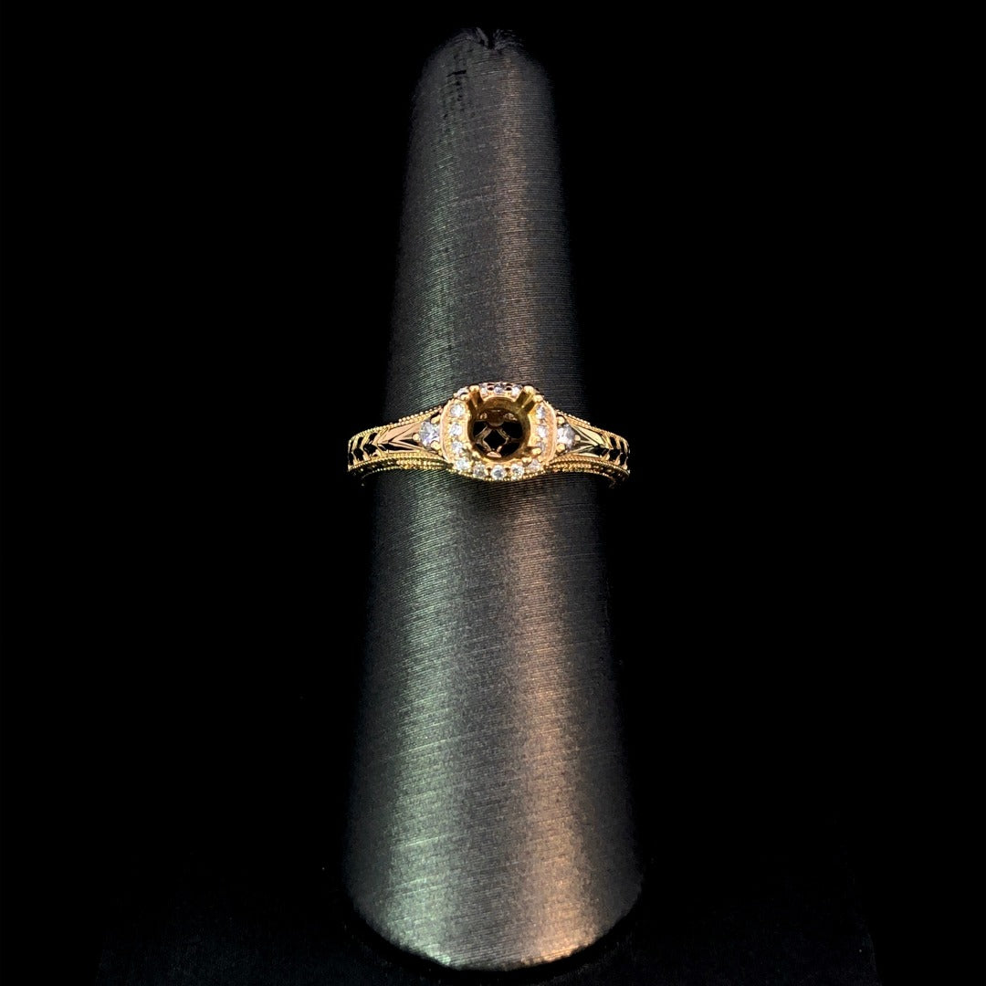 Elevate your style with this stunning semi mount. Combining modern design with vintage flair, this piece features a halo and 2 round diamond side stones, totaling .15ctw. The intricate etching in 14kt yellow gold adds a touch of elegance. Choose your center stone from our wide selection and we'll set and size it for you, typically all in one day. Price is for the semi mount only. Center stone will be added at an additional cost. This ring is a size 7. If that size is not a perfect fit, first time sizing is free at the time of purchase.
